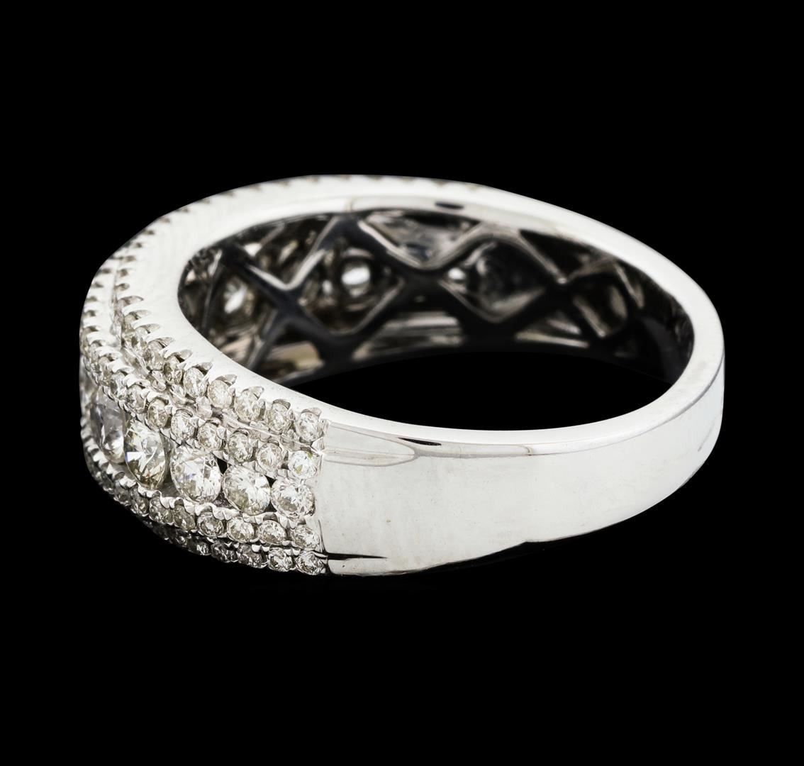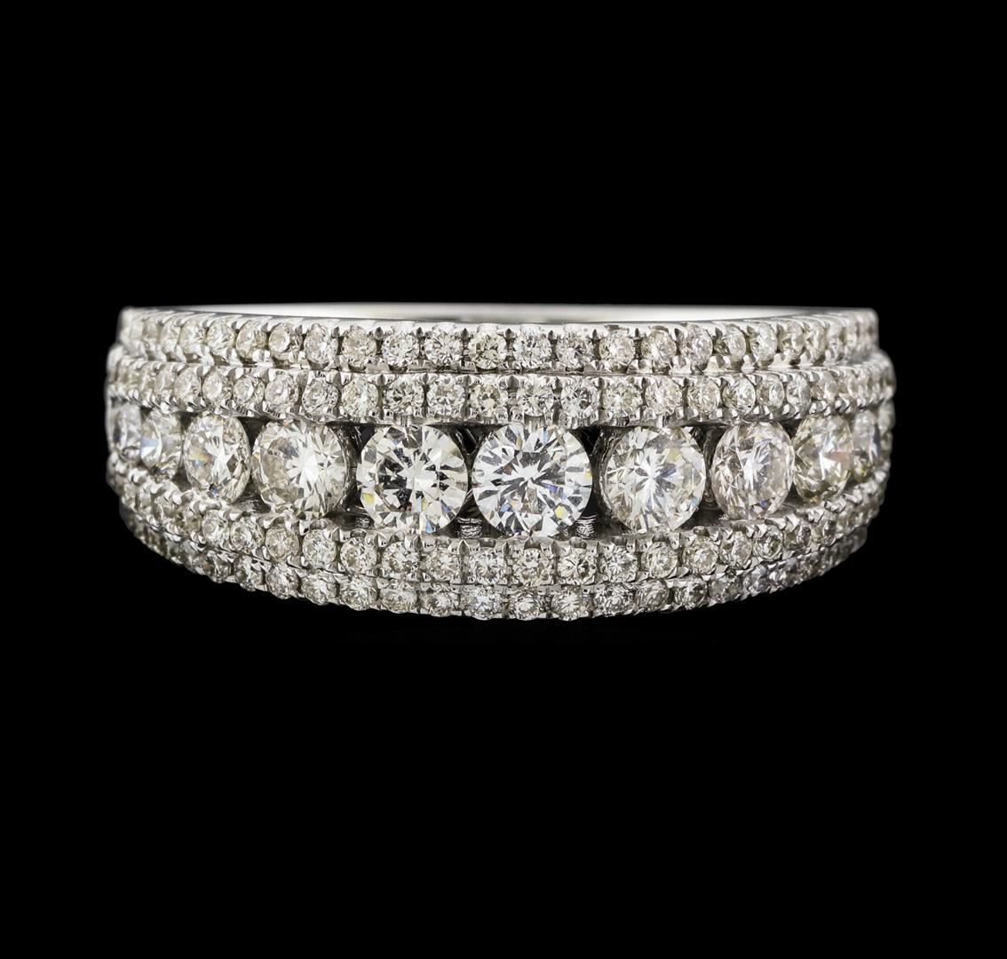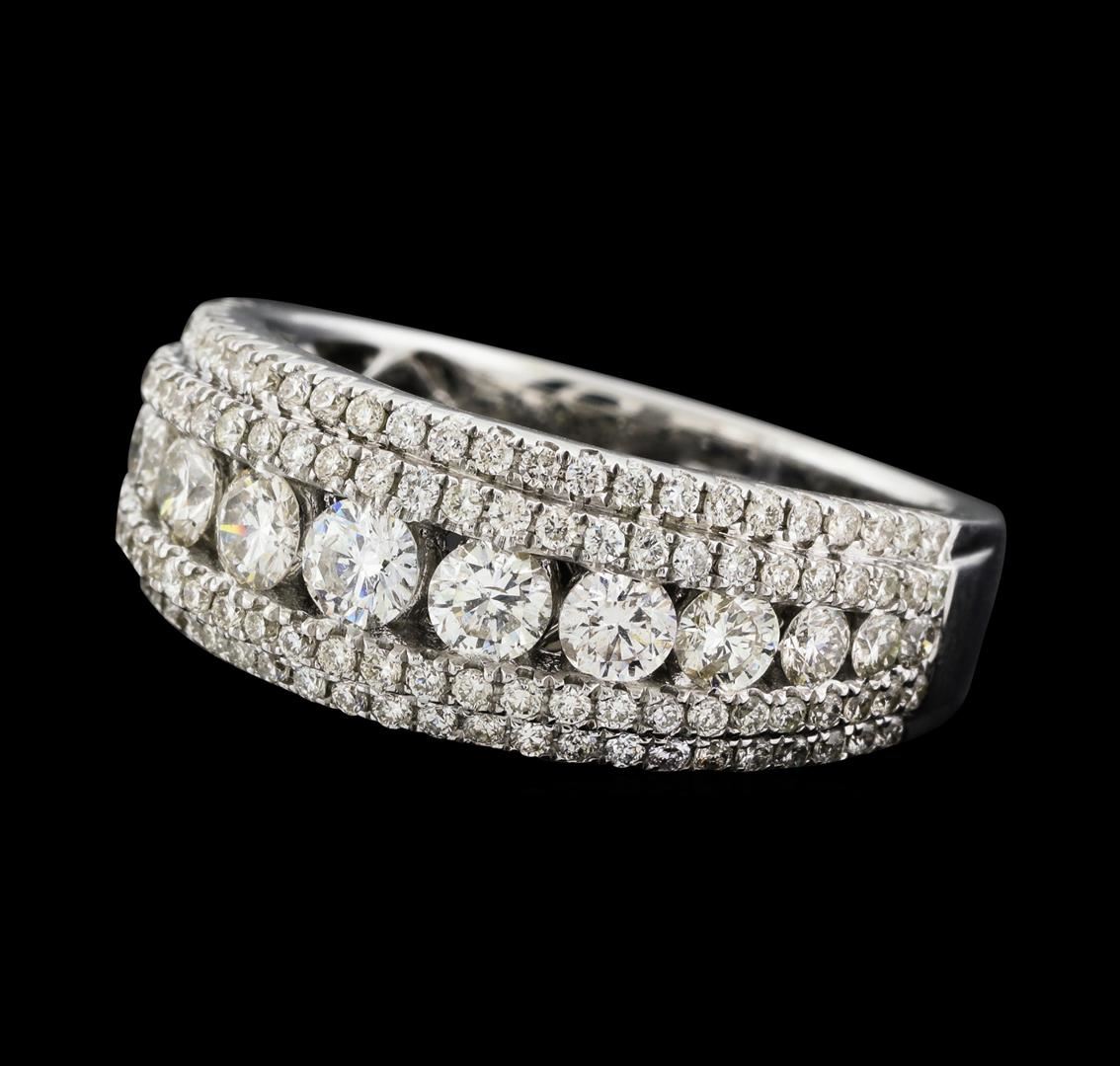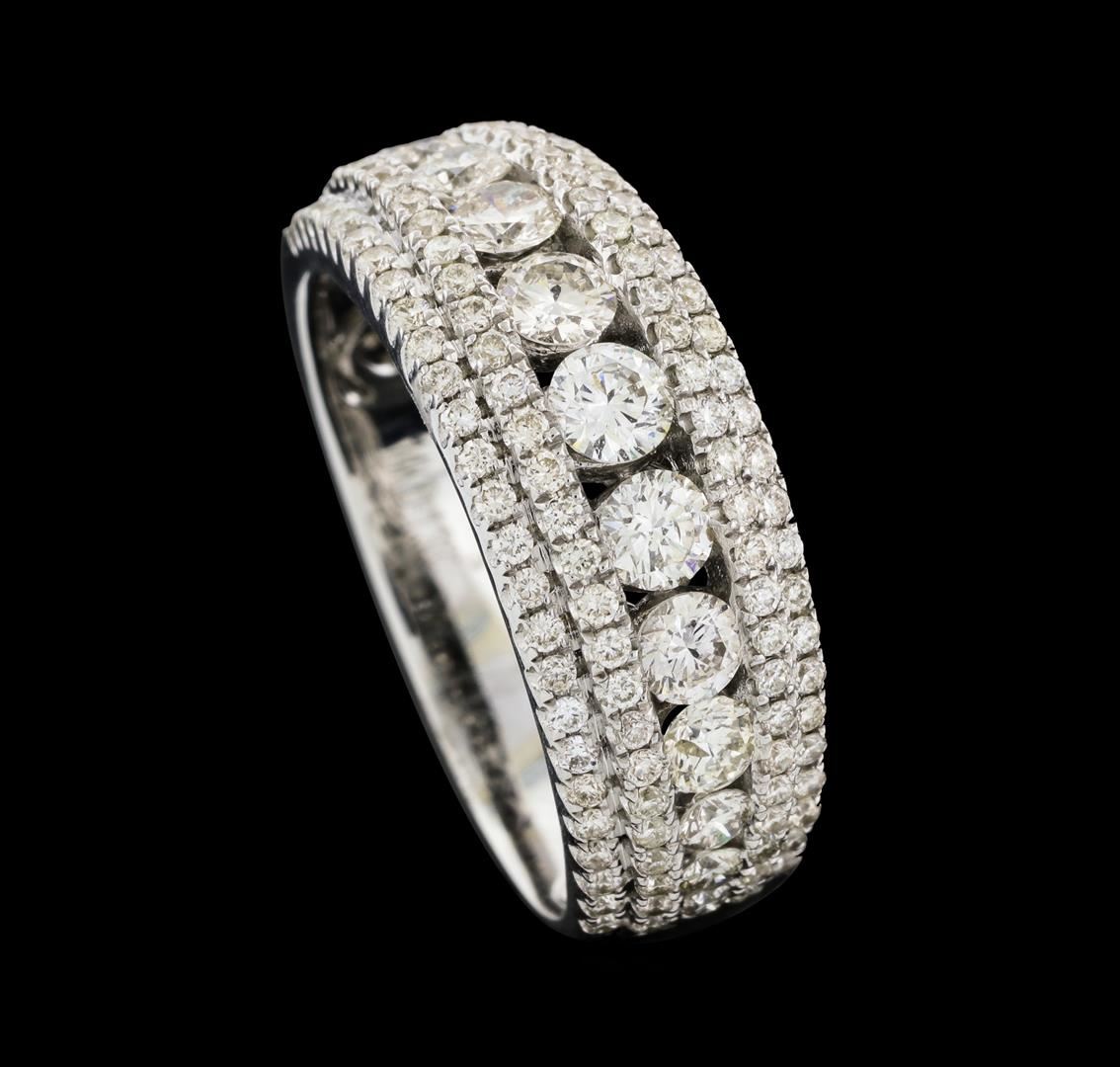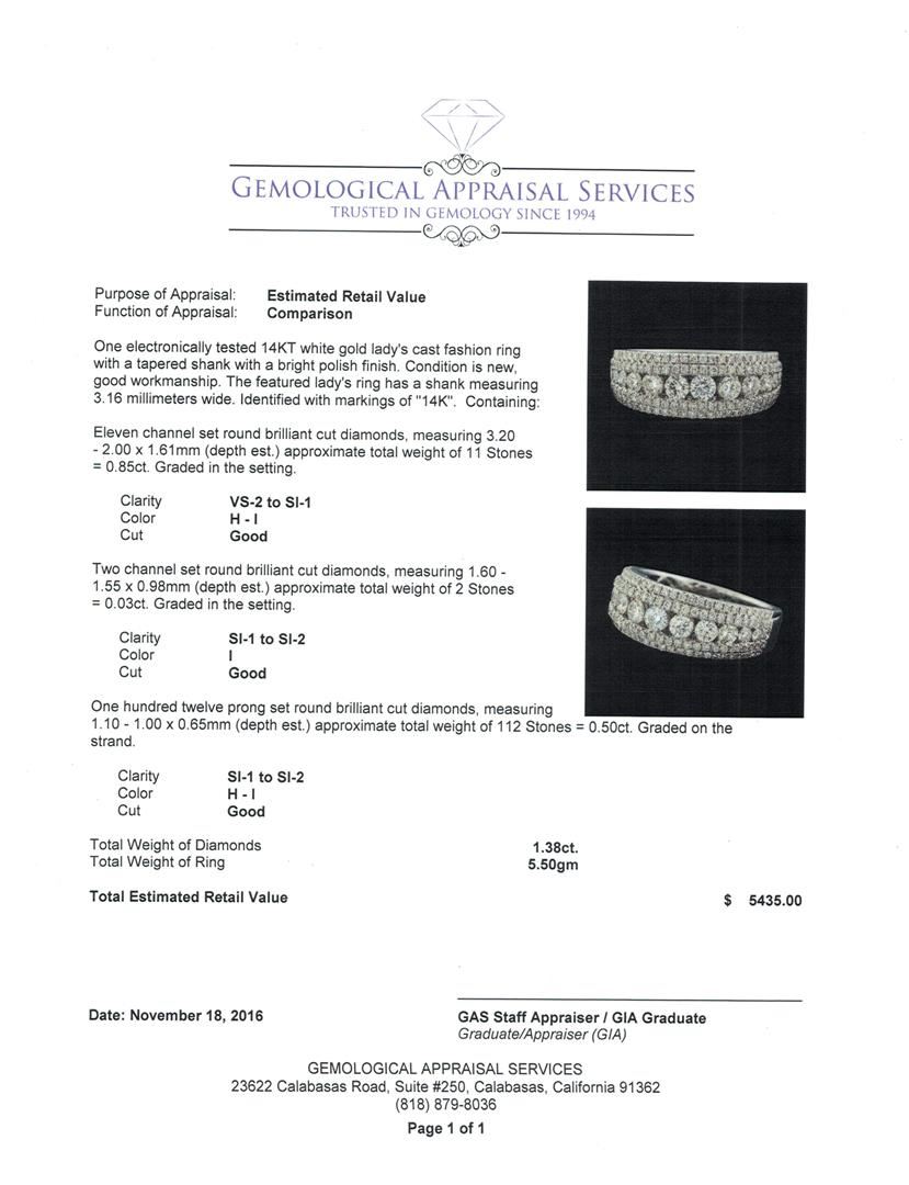 One electronically tested 14KT white gold lady's cast fashion ring with a tapered shank with a bright polish finish. The featured lady's ring has a shank measuring 3.16 millimeters wide. Identified with markings of '14K'. Condition is new, good workmanship. Containing: Eleven channel set round brilliant cut diamonds, measuring 3.20 - 2.00 x 1.61mm (depth est.) approximate total weight of 11 Stones = 0.85ct. Graded in the setting. Clarity VS-2 to SI-1. Color: H - I Cut Good Two channel set round brilliant cut diamonds, measuring 1.60 - 1.55 x 0.98mm (depth est.) approximate total weight of 2 Stones = 0.03ct. Graded in the setting. Clarity SI-1 to SI-2. Color: I Cut Good One Hundred Twelve prong set round brilliant cut diamonds, measuring 1.10 - 1.00 x 0.65mm (depth est.) approximate total weight of 112 Stones = 0.50ct. Graded on the strand. Clarity SI-1 to SI-2. Color: H - I Cut Good. Total Weight of Diamonds 1.38ct.. Total Weight of Ring 5.50gm. GAS Appraised at $5,435.00.