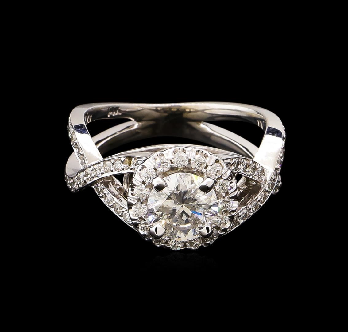 One electronically tested 14KT white gold lady's cast wedding ring with a crossover split shank with a bright polish finish. The featured lady's ring has a shank measuring 3.15 millimeters wide. Identified with markings of "14K". Condition is new, good workmanship. Containing: One prong set round brilliant cut diamond, measuring 6.39 - 6.38 x 3.75mm (depth est.) approximate weight of 0.93ct. Graded in the setting. Clarity: I-2. Color: F - G. Cut Very Good Fifteen prong set round brilliant cut diamonds, measuring 1.50 - 1.40 x 0.90mm (depth est.) approximate total weight of 15 Stones = 0.18ct. Graded in the setting. Clarity: SI-1 to I-1. Color: G - Good Forty prong set round brilliant cut diamonds, measuring 1.25 - 1.15 x 0.74mm (depth est.) approximate total weight of 40 Stones = 0.27ct. Graded in the setting. Clarity: SI-1 to I-1. Color: G - Good. Total Weight of Diamonds 1.38ct. Total Weight of Ring 5.20gm. GAS Appraised at $7,470.00.