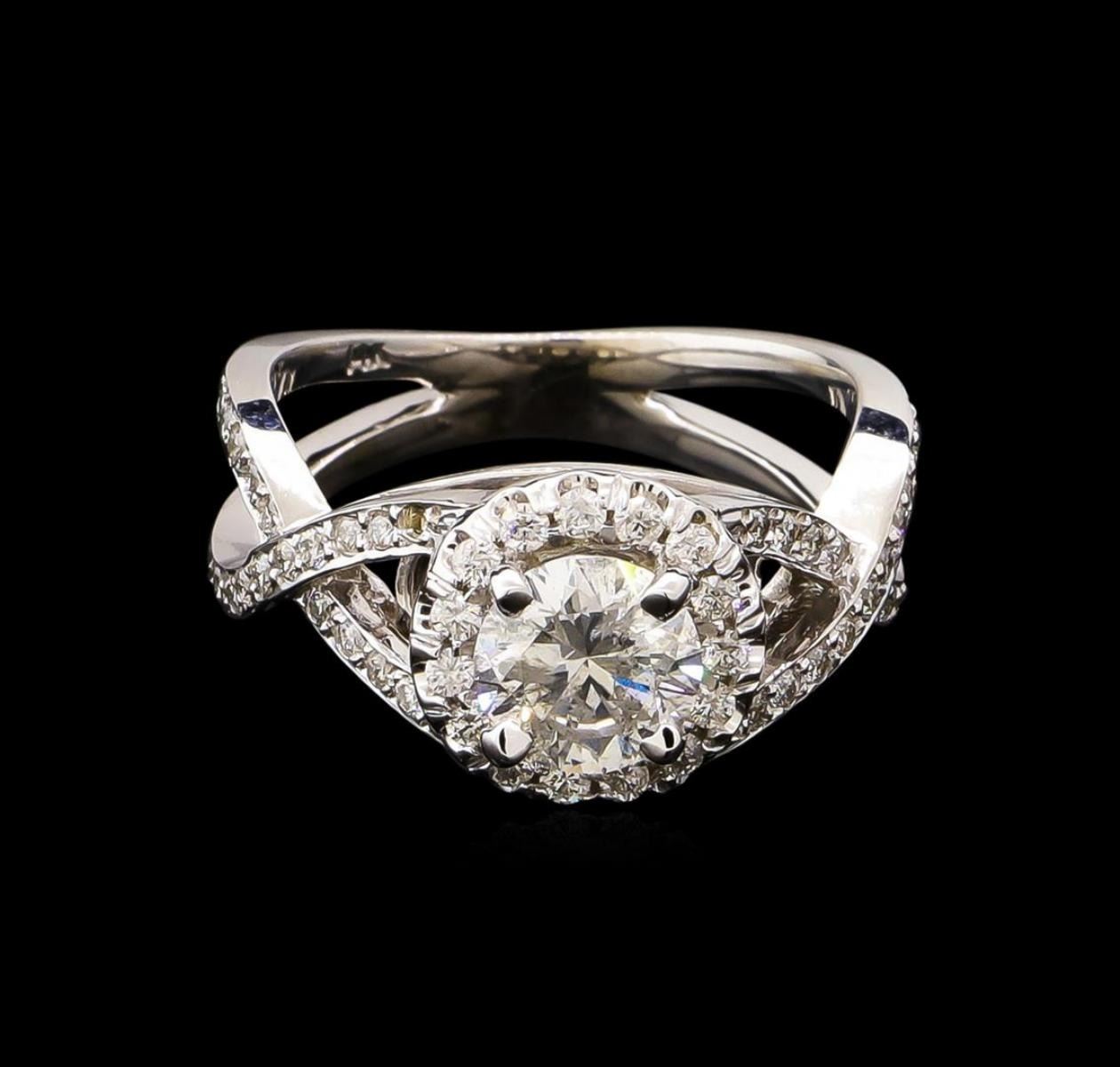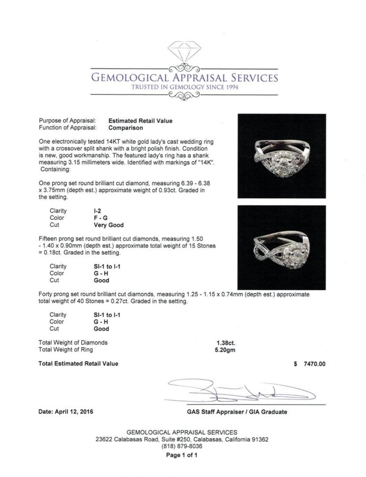 One electronically tested 14KT white gold lady's cast wedding ring with a crossover split shank with a bright polish finish. The featured lady's ring has a shank measuring 3.15 millimeters wide. Identified with markings of "14K". Condition is new, good workmanship. Containing: One prong set round brilliant cut diamond, measuring 6.39 - 6.38 x 3.75mm (depth est.) approximate weight of 0.93ct. Graded in the setting. Clarity: I-2. Color: F - G. Cut Very Good Fifteen prong set round brilliant cut diamonds, measuring 1.50 - 1.40 x 0.90mm (depth est.) approximate total weight of 15 Stones = 0.18ct. Graded in the setting. Clarity: SI-1 to I-1. Color: G - Good Forty prong set round brilliant cut diamonds, measuring 1.25 - 1.15 x 0.74mm (depth est.) approximate total weight of 40 Stones = 0.27ct. Graded in the setting. Clarity: SI-1 to I-1. Color: G - Good. Total Weight of Diamonds 1.38ct. Total Weight of Ring 5.20gm. GAS Appraised.
