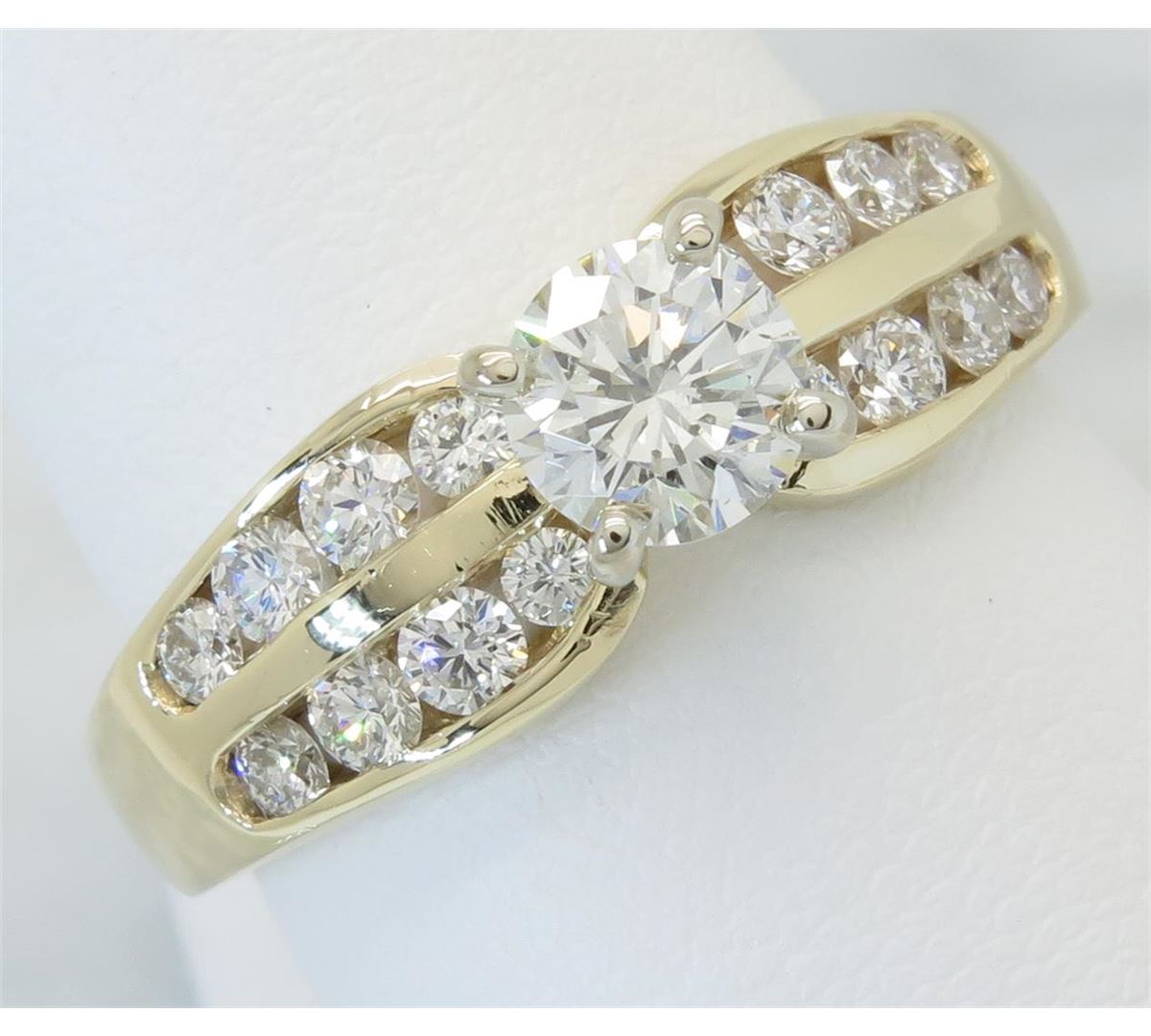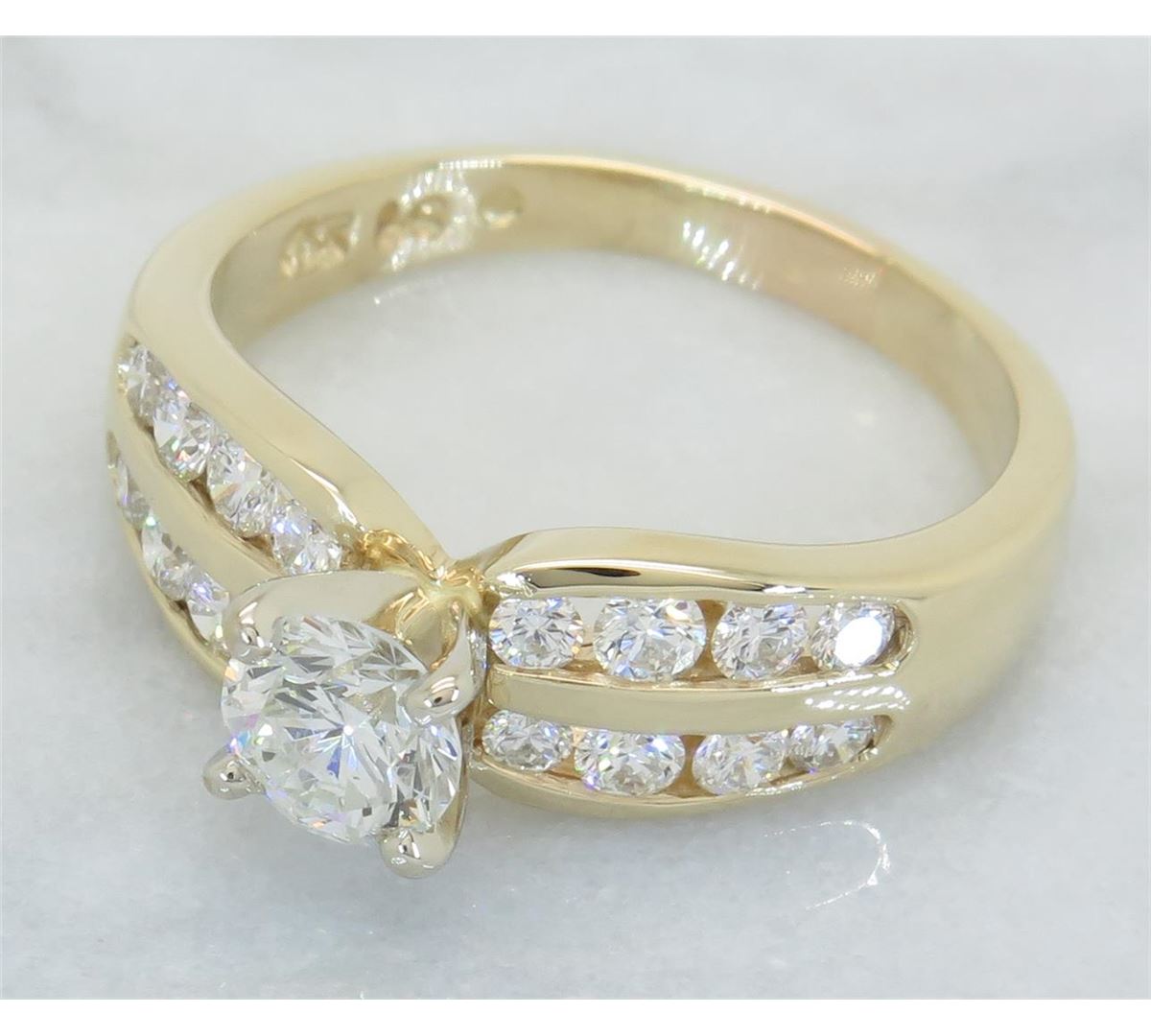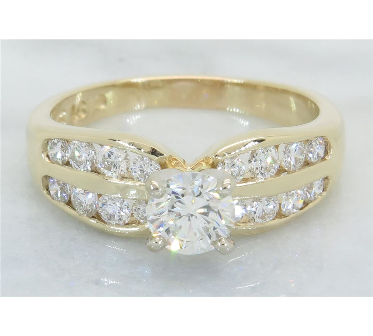 One tested 14K yellow gold diamond ring. Containing: One .74CT Round Brilliant Cut Diamond. Clarity: I1, Color: G-H. 16 Round Brilliant Cut Diamonds. Approximate total diamond weight: 1.38CTW. All diamonds are graded in the mounting unless otherwise stated. Weight of ring: 5.3 grams, Size: 8.0.