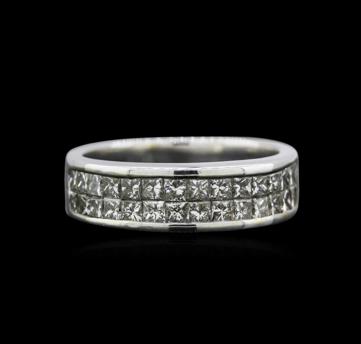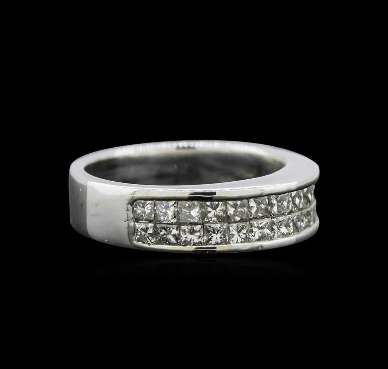 One electronically tested 18KT white gold ladies cast diamond wedding band with a bright polish finish. Identified with markings of "18K". Condition is new. Containing: Twenty-Eight invisible set princess cut diamonds, measuring 2.00 x 2.00 x 1.50mm (depth est.) approximate total weight of 28 Stones = 1.38ct. Clarity: VS-2 to SI-1. Color: H - I, Cut is Good. Diamonds are graded in the mounting, unless otherwise stated. Total Weight of Diamonds 1.38ct. Total Weight of Wedding Band 7.00gm. GGL Appraised.
