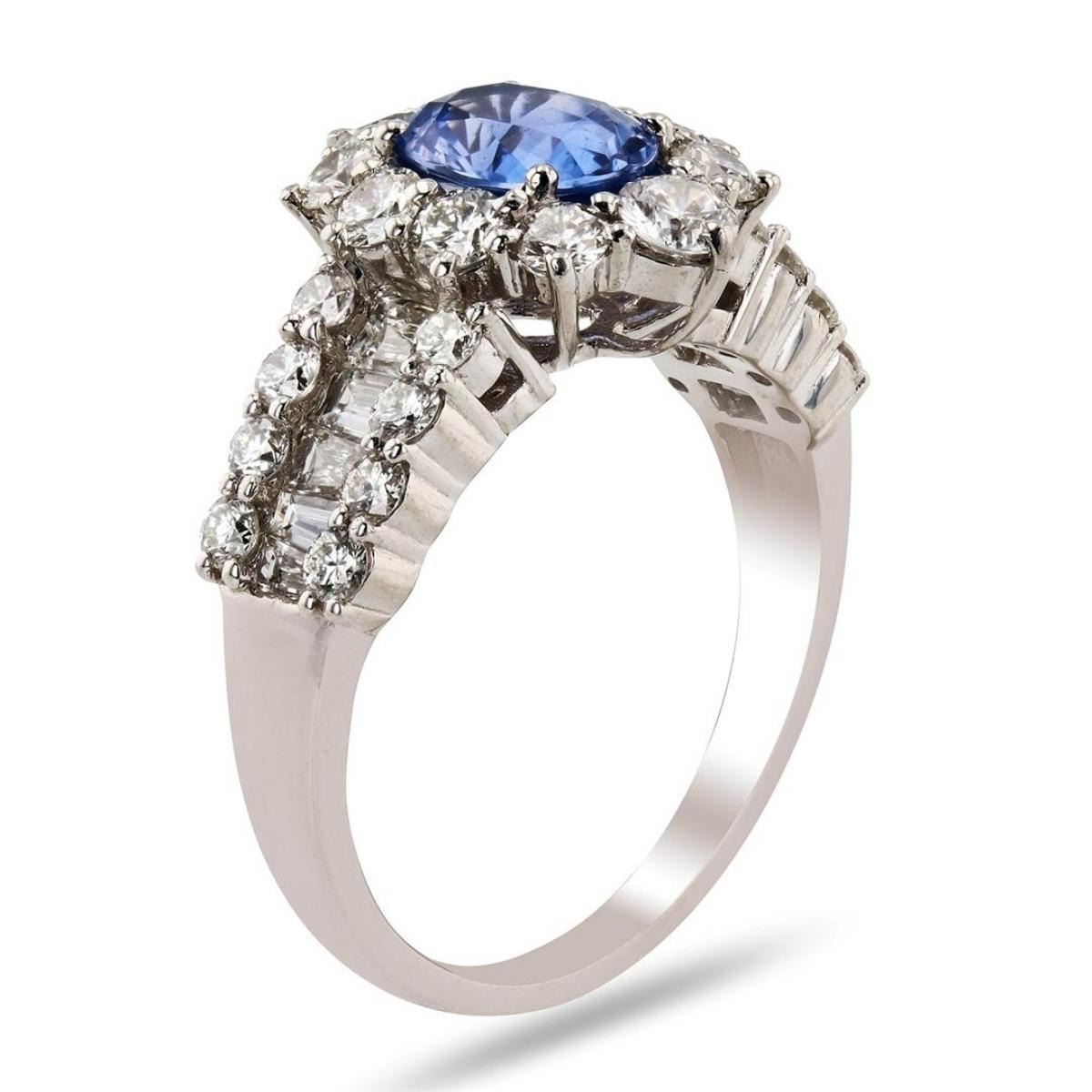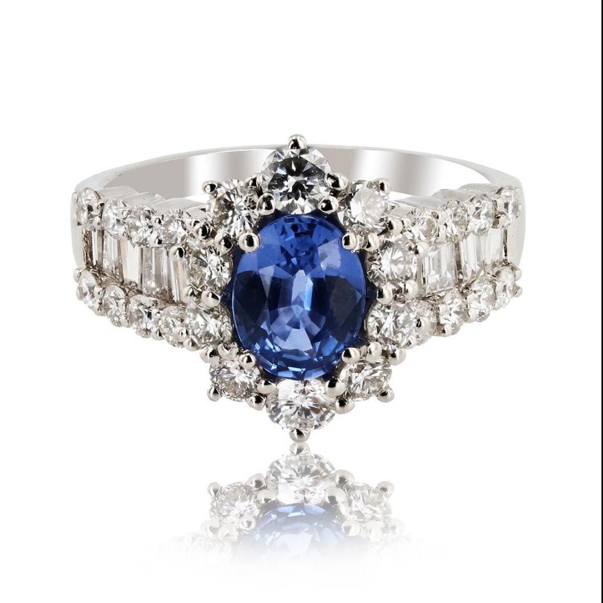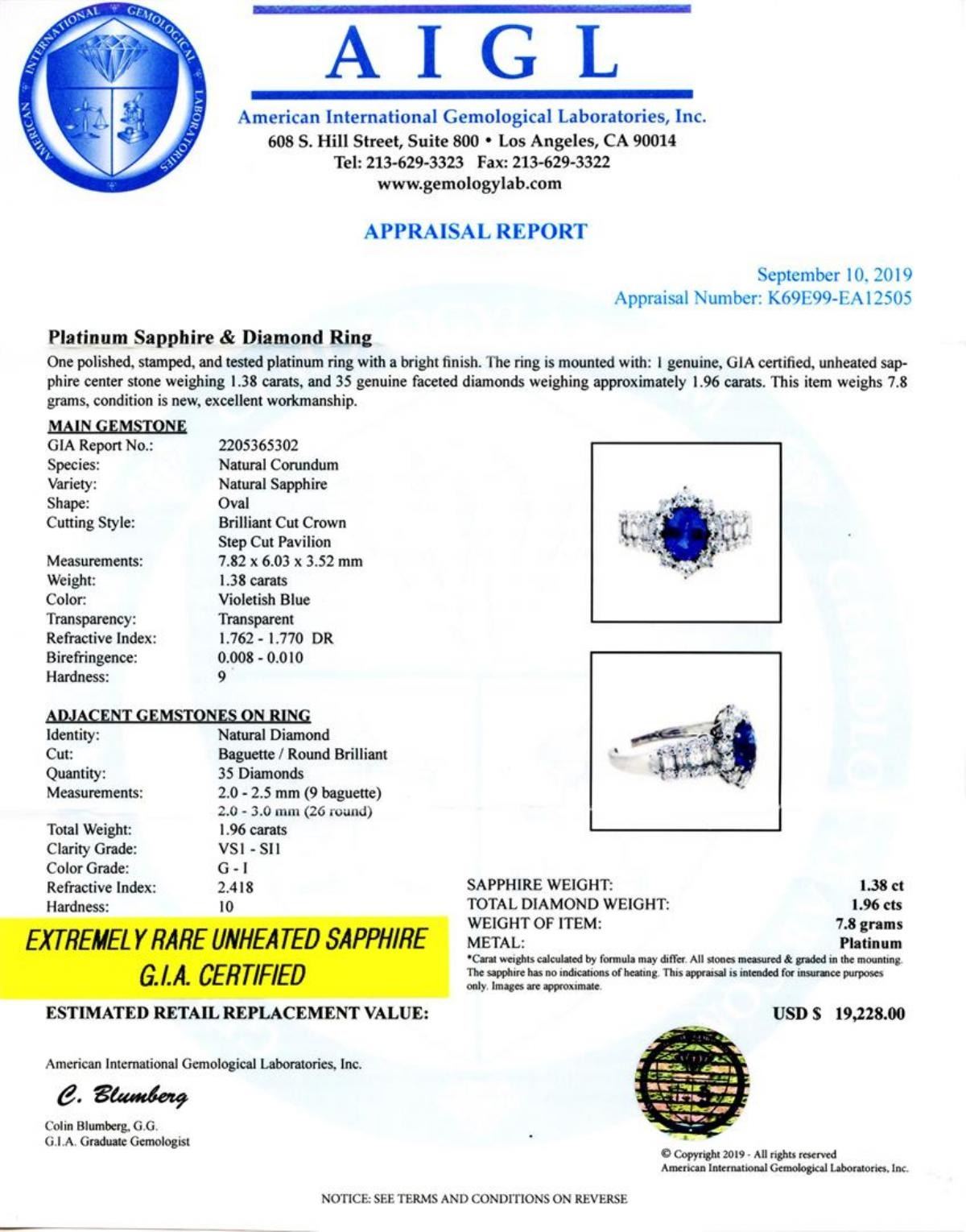 Platinum Sapphire & Diamond Ring One polished, stamped, and tested platinum ring with a bright finish. The ring is mounted with: 1 genuine, GIA certified, unheated sap-phire center stone weighing 1.38 carats, and 35 genuine faceted diamonds weighing approximately 1.96 carats. This item weighs 7.8 grams, condition is new, excellent workmanship. MAIN GEMSTONE GIA Report No.: 2205365302 Species: Natural Corundum Variety: Natural Sapphire Shape: Oval Cutting Style: Brilliant Cut Crown Step Cut Pavilion Measurements: 7.82 x 6.03 x 3.52 mm Weight: 1.38 carats Color: Violetish Blue Transparency: Transparent Refractive Index: 1.762 - 1.770 DR Birefringence: 0.008 - 0.010 Hardness: 9 ADJACENT GEMSTONES ON RING Identity: Natural Diamond Cut: Baguette / Round Brilliant Quantity: 35 Diamonds Measurements: 2.0 - 2.5 mm (9 baguette) 2.0 - 3.0 mm (26 ruund) Total Weight: 1.96 carats Clarity Grade: VS1 - SI1 Color Grade: G - I Refractive Index: 2.418 Hardness: 10 EXTREMELY RARE UNHEATED SAPPHIRE G.I.A. CERTIFIED ESTIMATED RETAIL REPLACEMENT VALUE: SAPPHIRE WEIGHT: 1.38ct TOTAL DIAMOND WEIGHT: 1.96ctw WEIGHT OF ITEM: 7.8 grams METAL: Platinum