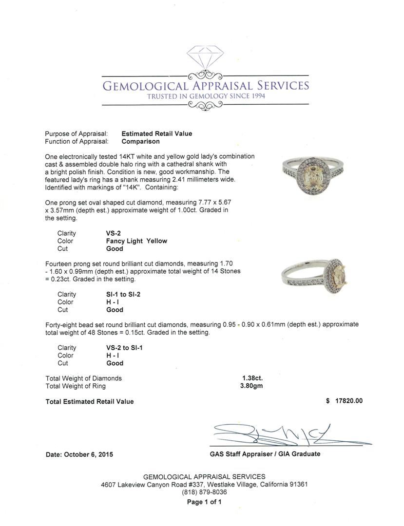 One electronically tested 14KT white and yellow gold lady's combination cast & assembled double halo ring with a cathedral shank with a bright polish finish. The featured lady's ring has a shank measuring 2.41 millimeters wide. Identified with markings of "14K". Condition is new, good workmanship. Containing: One prong set oval shaped cut diamond, measuring 7.77 x 5.67 x 3.57mm (depth est.) approximate weight of 1.00ct. Graded in the setting. Clarity: VS-2 Cut Good Fourteen prong set round brilliant cut diamonds, measuring 1.70 - 1.60 x 0.99mm (depth est.) approximate total weight of 14 Stones = 0.23ct. Graded in the setting. Clarity: SI-1 to SI-2. Color: H - I. Cut Good Forty-Eight bead set round brilliant cut diamonds, measuring 0.95 - 0.90 x 0.61mm (depth est.) approximate total weight of 48 Stones = 0.15ct. Graded in the setting. Clarity: VS-2 to SI-1. Color: H - I. Cut Good. Total Weight of Diamonds 1.38ct. Total Weight of Ring 3.80gm. GAS Appraised at $17,820.00.
