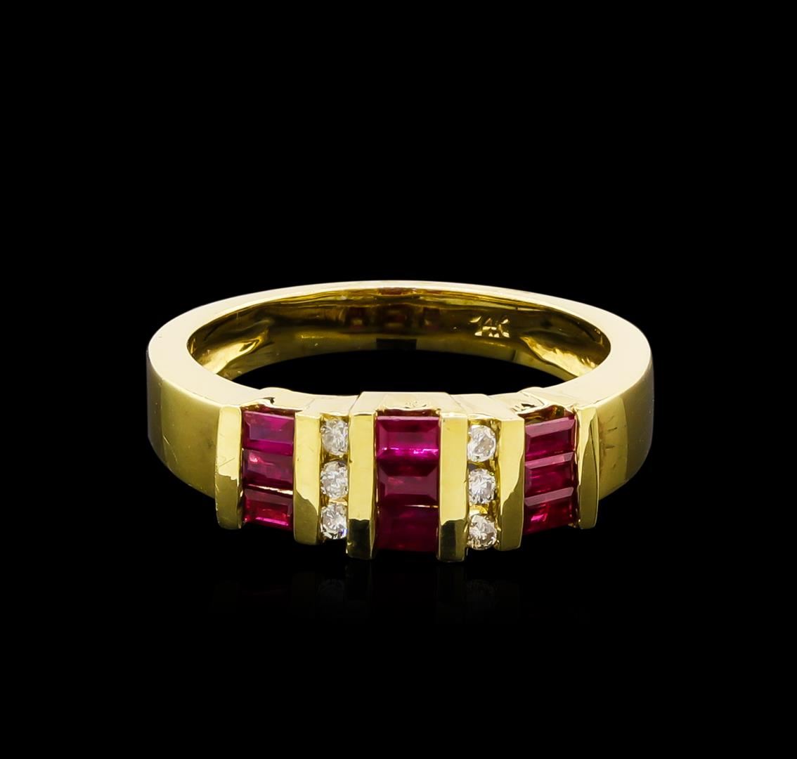 One ring featuring: 14KT yellow gold weighing 4.76 grams containing rubies with a total weight of 1.38ct and side diamonds with a total weight of 0.14ct.