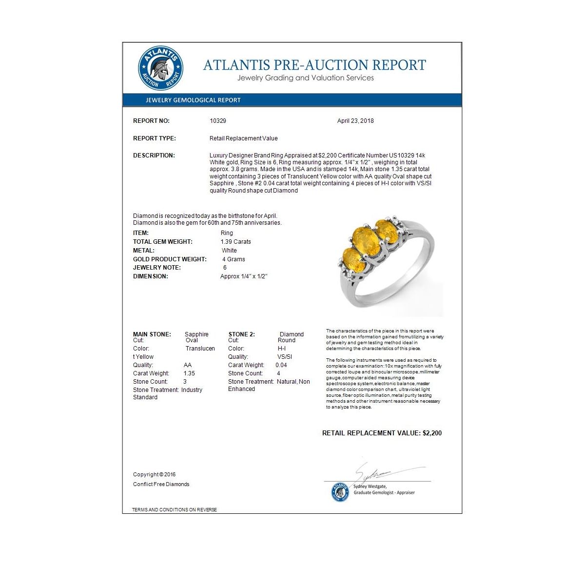 REF-31W3F -10329 ---- 1.39 CTW Yellow Sapphire & Diamond Ring 14K White Gold ---- Luxury Designer Brand Ring Appraised at $2,200 Certificate Number US10329 14k White gold, Ring Size is 6, Ring measuring approx. 1/4" x 1/2" , weighing in total approx. 3.8 grams. Made in the USA and is stamped 14k, Main stone 1.35 carat total weight containing 3 pieces of Translucent Yellow color with AA quality Oval shape cut Sapphire , Stone #2 0.04 carat total weight containing 4 pieces of H-I color with VS/SI quality Round shape cut Diamond