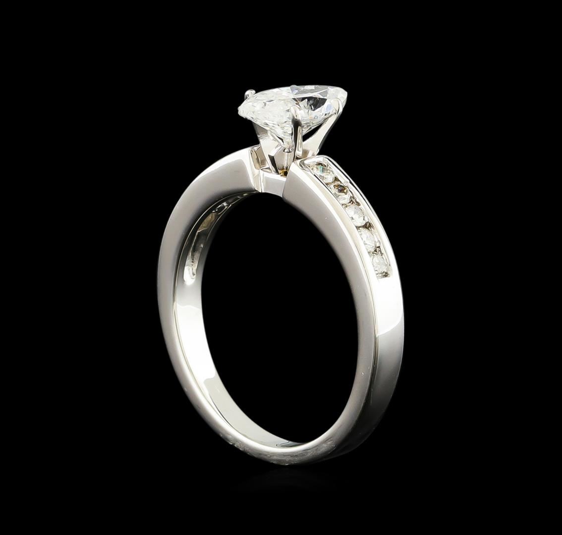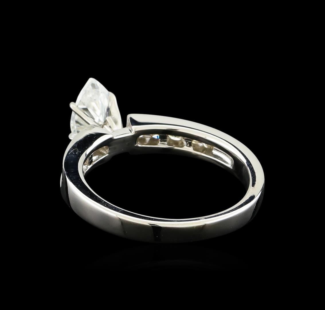One electronically tested 14KT white gold ladies cast diamond unity ring with a bright polish finish. The featured diamond is supported by diamond ribbon shoulders, completed by a two millimeter wide band. Identified with markings of "14K". Condition is new, good workmanship. Containing: One prong set marquise shaped cut diamond, measuring 9.60 x 5.20 x 3.70mm (depth est.) approximate weight of 1.09ct. Graded in the setting. Clarity: I-2. Color: 71.2%. Table 53.9%. Ten channel set round brilliant cut diamonds, measuring 2.00 - 1.90 x 1.17mm (depth est.) approximate total weight of 10 Stones = 0.30ct. Graded in the setting. Clarity: SI-2 to I-2. Color: H - I. Total Weight of Diamonds 1.39ct. Total Weight of Ring 4.22gm. AIG Appraised at $5,840.00.