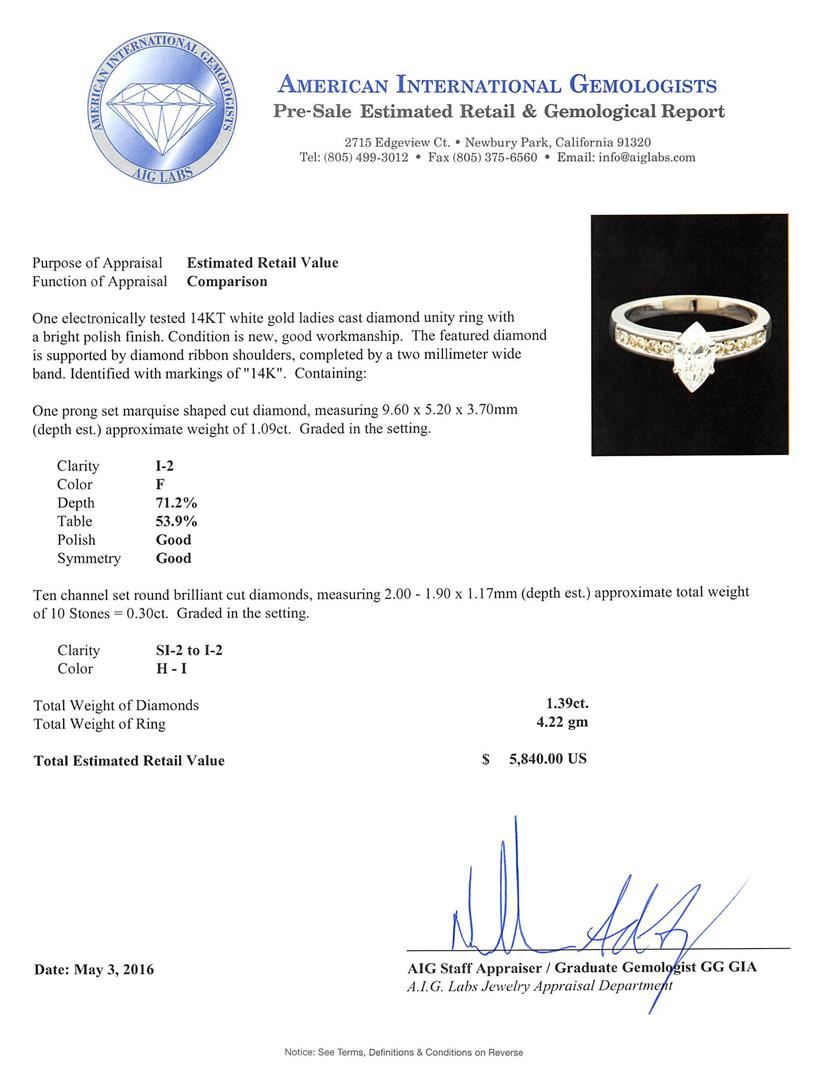 One electronically tested 14KT white gold ladies cast diamond unity ring with a bright polish finish. The featured diamond is supported by diamond ribbon shoulders, completed by a two millimeter wide band. Identified with markings of "14K". Condition is new, good workmanship. Containing: One prong set marquise shaped cut diamond, measuring 9.60 x 5.20 x 3.70mm (depth est.) approximate weight of 1.09ct. Graded in the setting. Clarity: I-2. Color: 71.2%. Table 53.9%. Ten channel set round brilliant cut diamonds, measuring 2.00 - 1.90 x 1.17mm (depth est.) approximate total weight of 10 Stones = 0.30ct. Graded in the setting. Clarity: SI-2 to I-2. Color: H - I. Total Weight of Diamonds 1.39ct. Total Weight of Ring 4.22gm. AIG Appraised at $5,840.00.