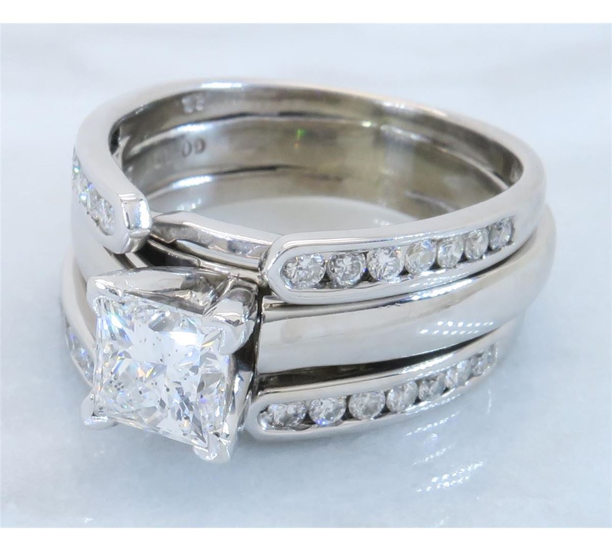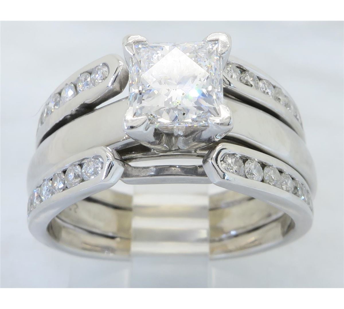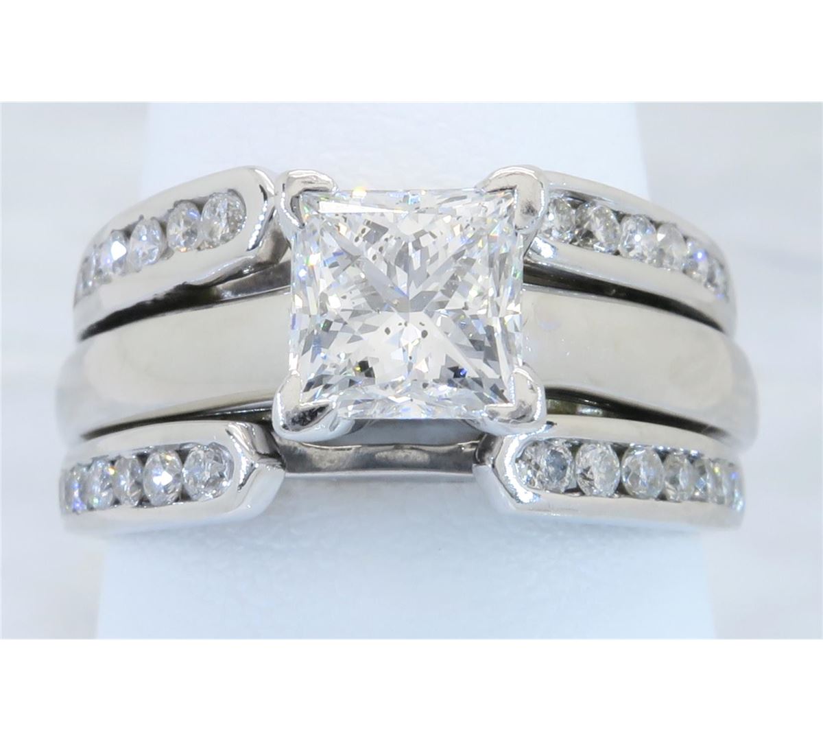 One tested 14K white gold diamond ring. Containing: One GSI Certified LEO Princess Cut Diamond set in a platinum head. Size: 1.00CT, Clarity: SI2, Color: E. 28 Round Brilliant Cut Diamonds. Approximate total diamond weight: 1.39CTW. All diamonds are graded in the mounting unless otherwise stated. Weight of ring: 8.7 grams, Size: 6.0. GSI Appraised.