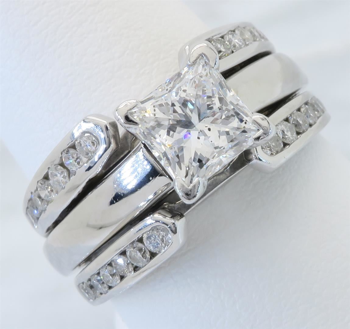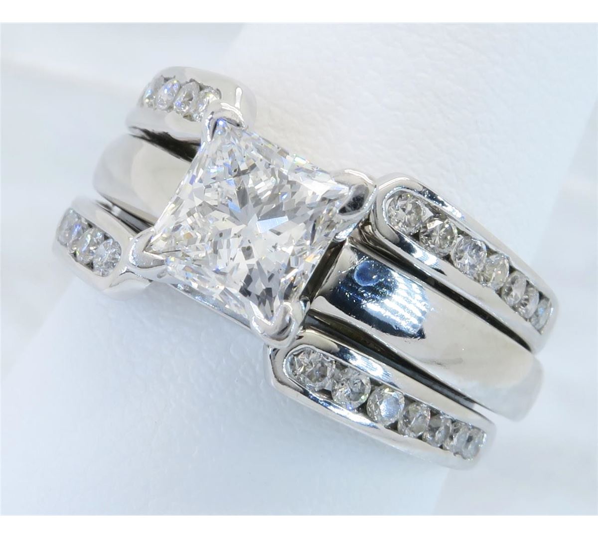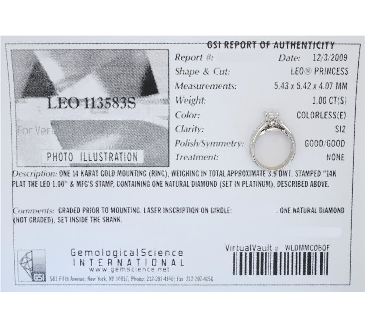 One tested 14K white gold diamond ring. Containing: One GSI Certified LEO Princess Cut Diamond set in a platinum head. Size: 1.00CT, Clarity: SI2, Color: E. 28 Round Brilliant Cut Diamonds. Approximate total diamond weight: 1.39CTW. All diamonds are graded in the mounting unless otherwise stated. Weight of ring: 8.7 grams, Size: 6.0. GSI Appraised.