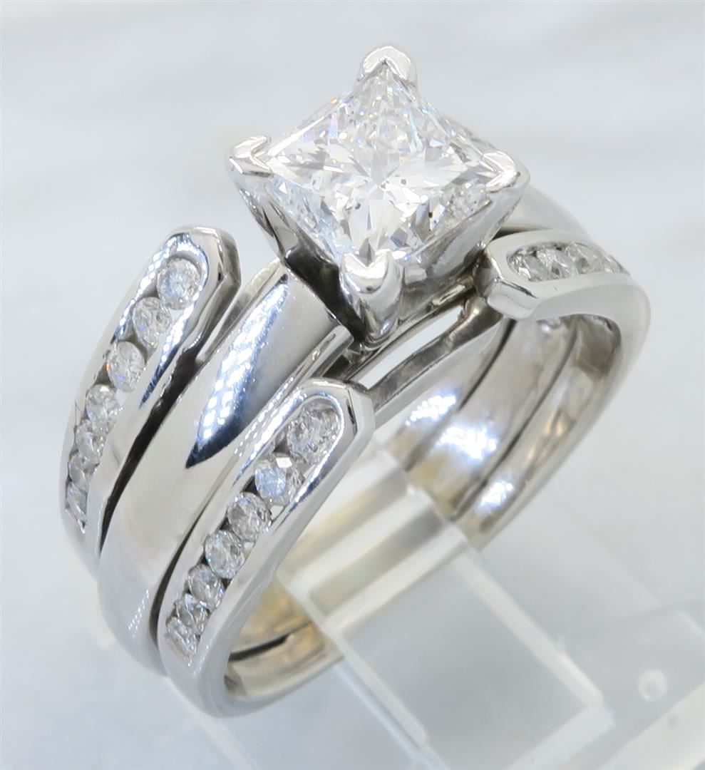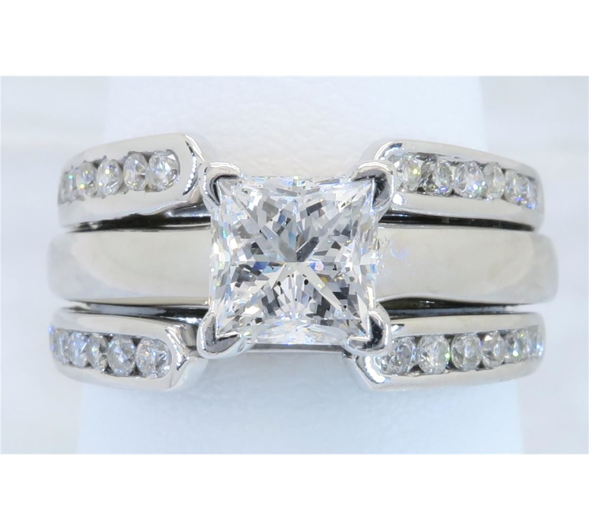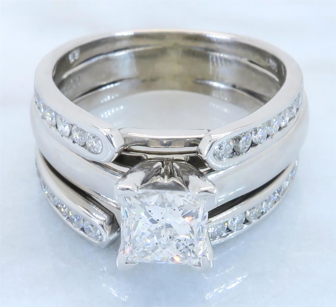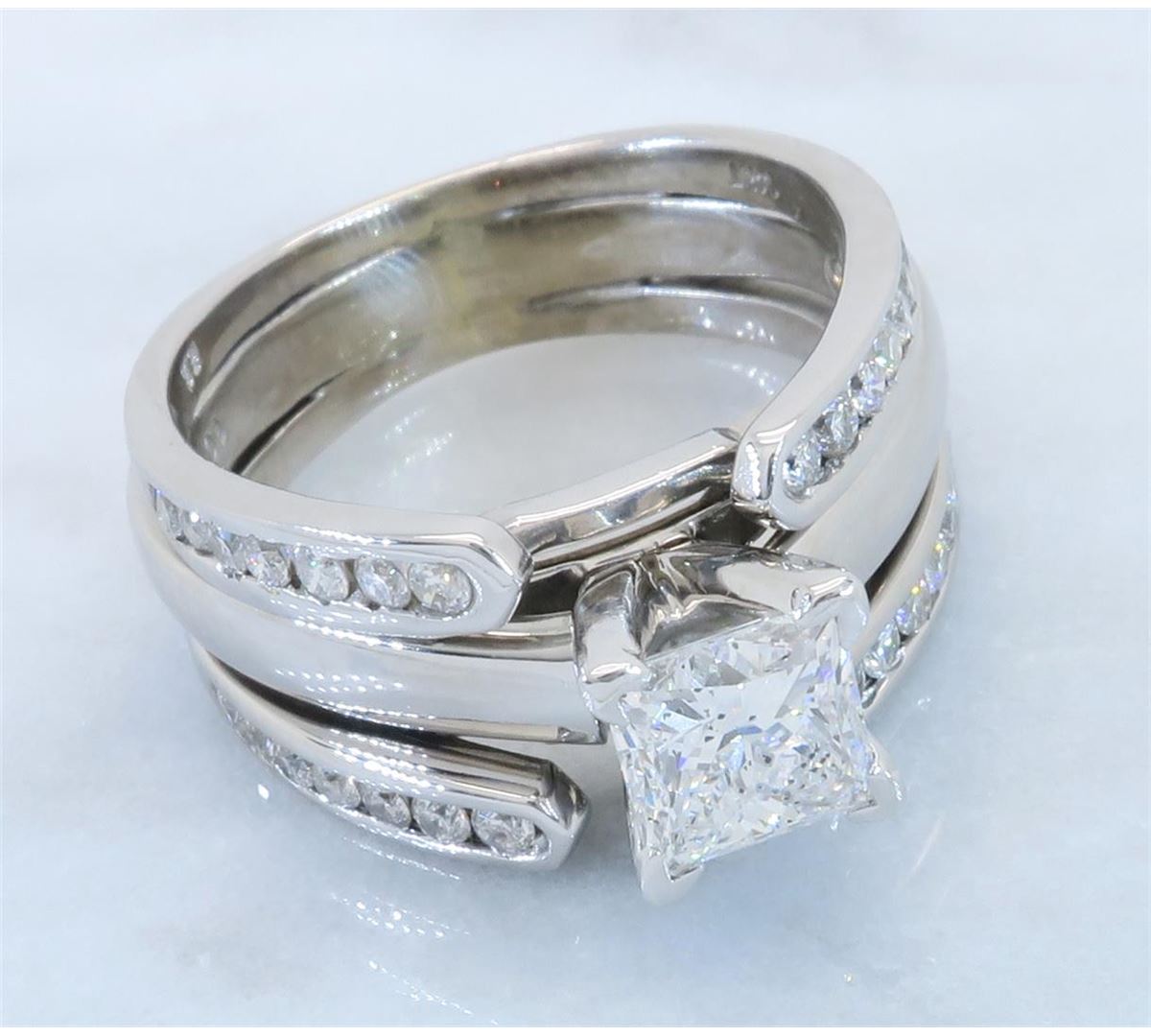 One tested 14K white gold diamond ring. Containing: One GSI Certified LEO Princess Cut Diamond set in a platinum head. Size: 1.00CT, Clarity: SI2, Color: E. 28 Round Brilliant Cut Diamonds. Approximate total diamond weight: 1.39CTW. All diamonds are graded in the mounting unless otherwise stated. Weight of ring: 8.7 grams, Size: 6.0. GSI Appraised.