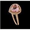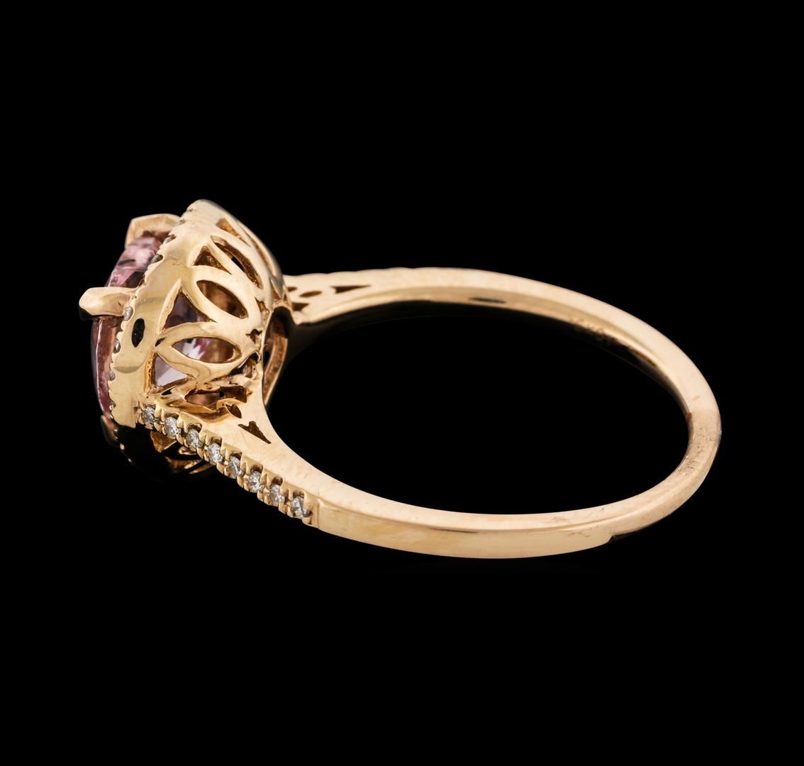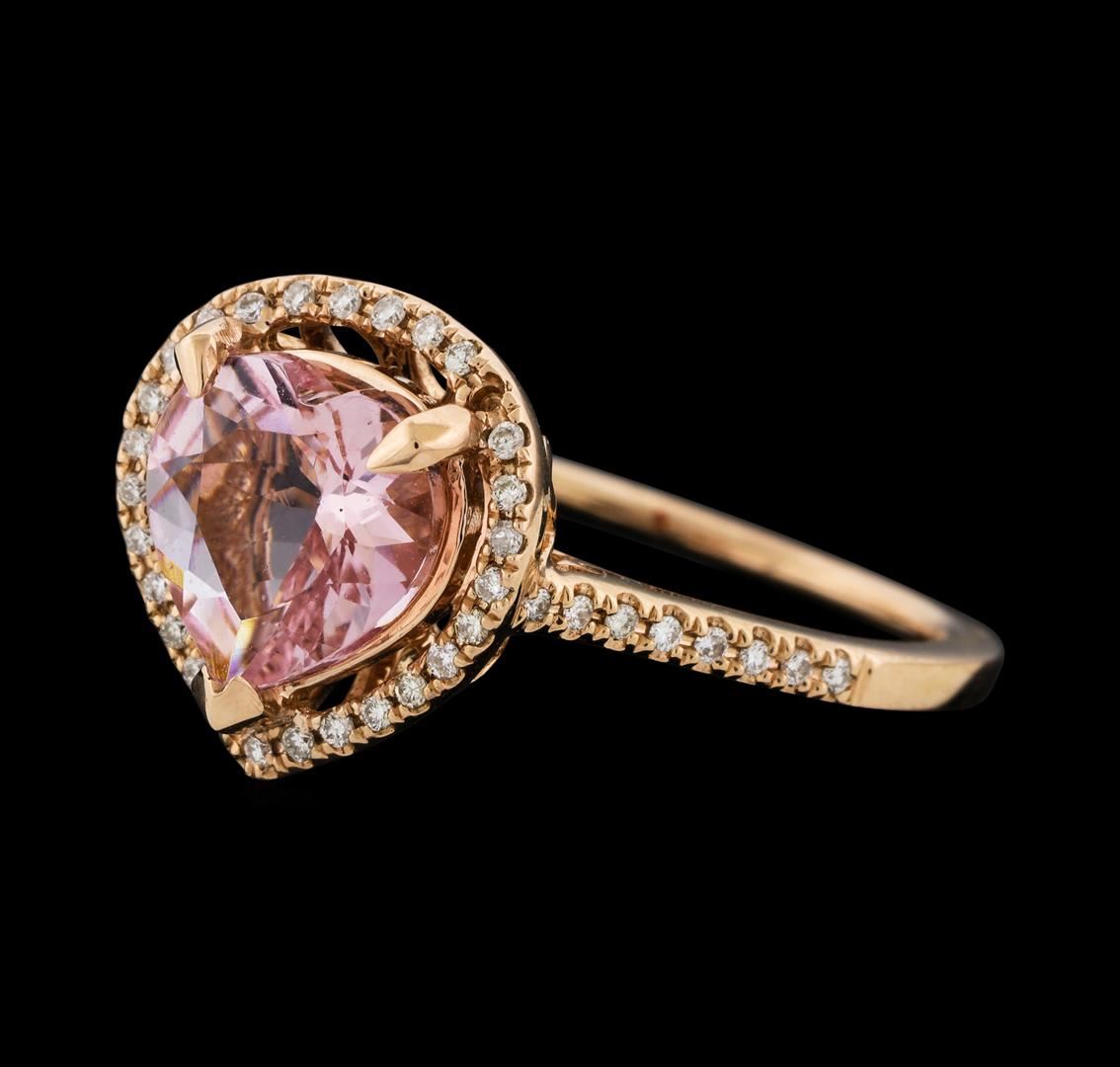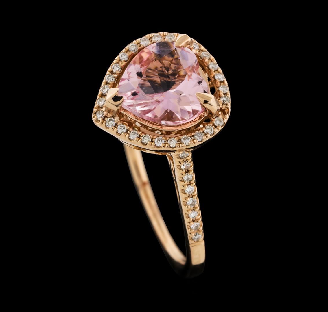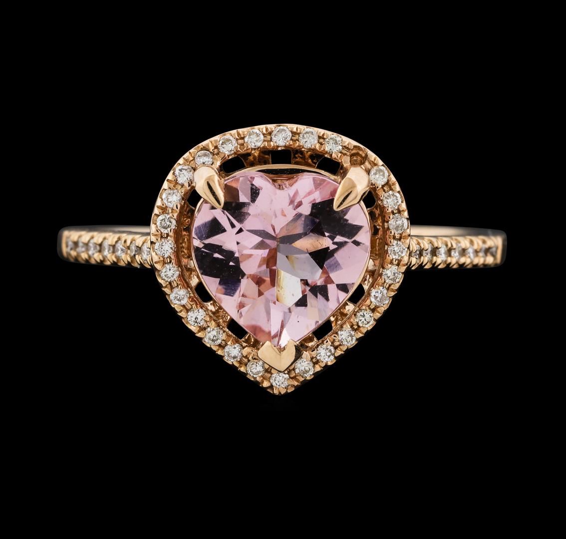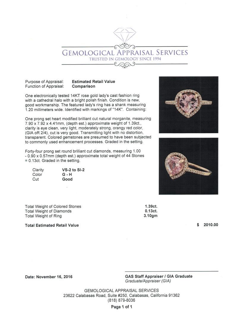 One electronically tested 14KT rose gold lady's cast fashion ring with a cathedral halo with a bright polish finish. The featured lady's ring has a shank measuring 1.20 millimeters wide. Identified with markings of '14K'. Condition is new, good workmanship. Containing: One prong set heart modified brilliant cut natural morganite, measuring 7.90 x 7.92 x 4.41mm, (depth est.) approximate weight of 1.39ct., clarity is eye clean, very light, moderately strong, orangy red color, (GIA oR 2/4), cut is very good. Transmitting light with no distortion, transparent. Colored gemstones are presumed to have been subjected to commonly used enhancement processes. Graded in the setting. Forty-Four prong set round brilliant cut diamonds, measuring 1.00 - 0.90 x 0.57mm (depth est.) approximate total weight of 44 Stones = 0.13ct. Graded in the setting. Clarity VS-2 to SI-2. Color: G - H Cut Good. Total Weight of Colored Stones 1.39ct.. Total Weight of Diamonds 0.13ct.. Total Weight of Ring 3.10gm. GAS Appraised at $2,010.00.