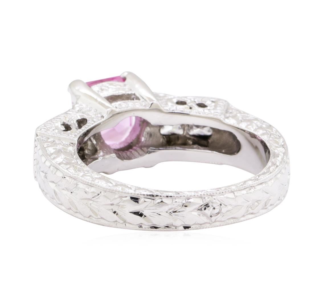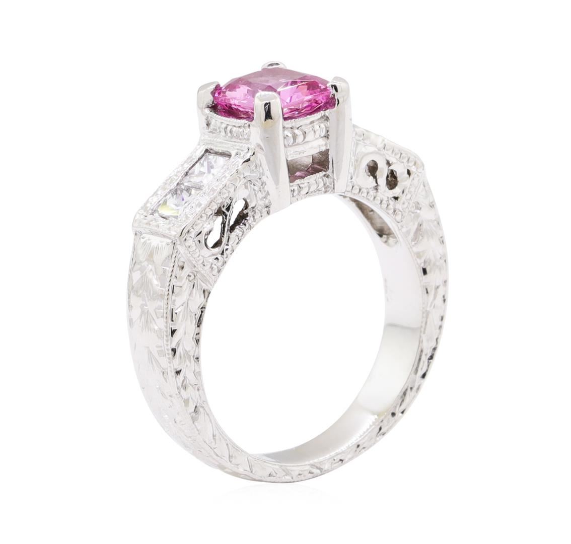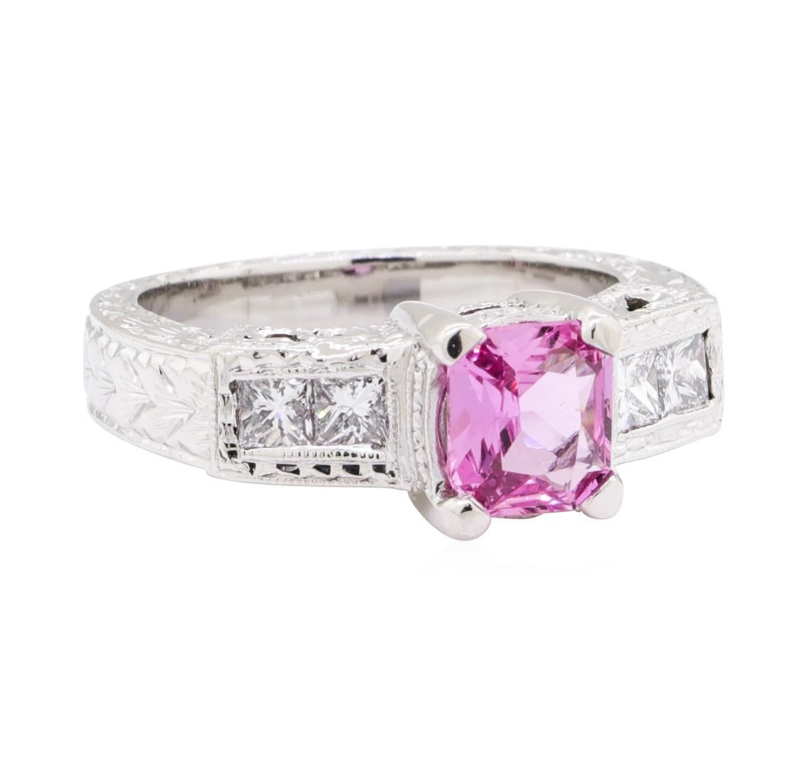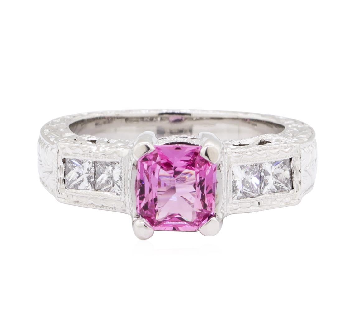 One electronically tested platinum lady's cast fashion ring with a cathedral channel with a hand engraving and milgrain detail finish. The featured lady's ring has a shank measuring 3.10 millimeters wide. Identified with markings of 'PLAT'. Condition is like new. Containing: One prong set radiant modified mixed cut natural pink sapphire, measuring 6.18 x 5.60 x 2.97mm, (depth est.) approximate weight of 0.99ct., clarity is eye clean, medium, moderately strong, slightly purplish red color, (GIA slpR 5/4), cut is good. Transmitting light with no distortion, transparent. Colored gemstones are presumed to have been subjected to commonly used enhancement processes. Graded in the setting. Four channel set princess cut diamonds, measuring 2.60 x 2.50 x 1.88mm (depth est.) approximate total weight of 4 Stones = 0.40ct. Graded in the setting. Color H - I Clarity VS-1 to VS-2 Cut Very Good. Total Weight of Colored Stones 0.99ct.. Total Weight of Diamonds 0.40ct.. Total Weight of Ring 10.20gm GAS Appraised at $5275.00. GAS Appraised at $5,275.00.
