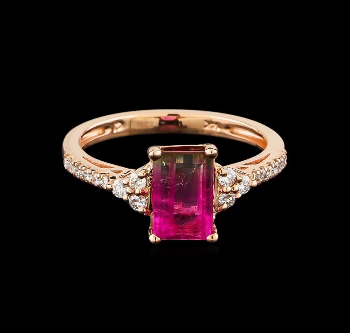 One prong set rectangular step cut natural bi-color tourmaline, measuring 8.35 x 5.50 x 3.10mm, approximate weight of 1.39ct., clarity is moderately included, type II, medium, very slightly grayish, slightly yellowish green color, (GIA slyG 5/3) to medium, moderately strong, slightly purplish red, (GIA slpR 5/4), cut is good. Transmitting light with a minimum of distortion, transparent. Naturally occurring internal & external characteristics are present. Graded in the setting. Eighteen prong set round brilliant cut diamonds, measuring 1.80 - 1.20 x 0.90mm (depth est.) approximate total weight of 18 Stones = 0.30ct. Graded in the setting. Clarity: SI-2 to I-1. Color: F - H. Total Weight of Colored Stones 1.39ct. Total Weight of Diamonds 0.30ct. Total Weight of Ring 2.83gm. AIG Appraised at $1,750.00.