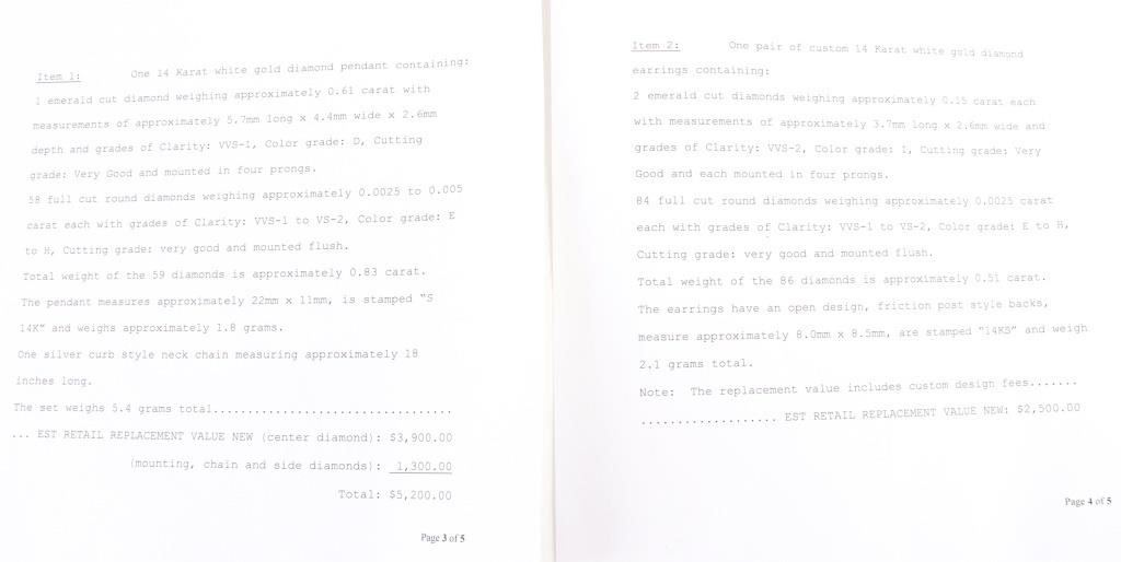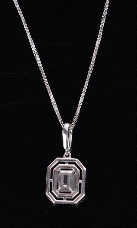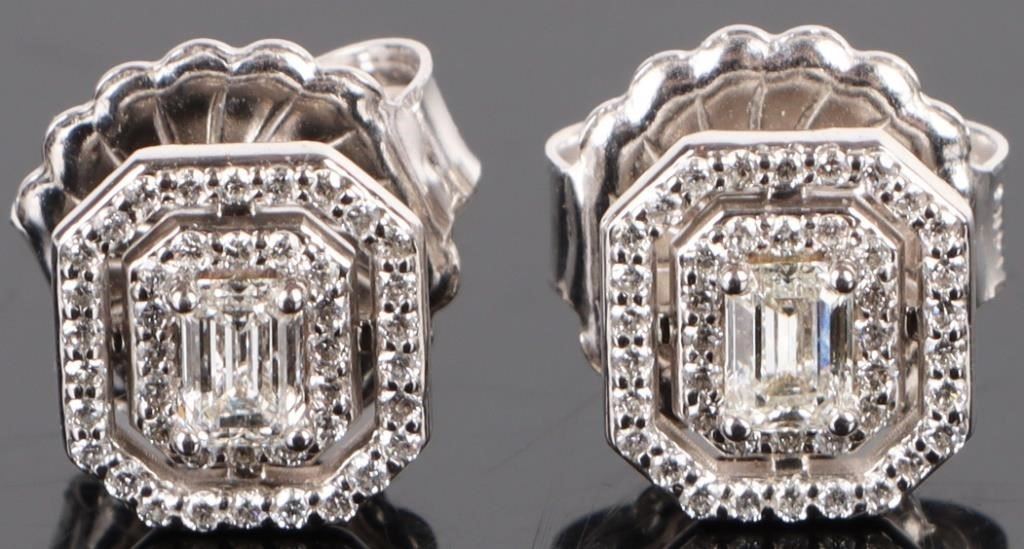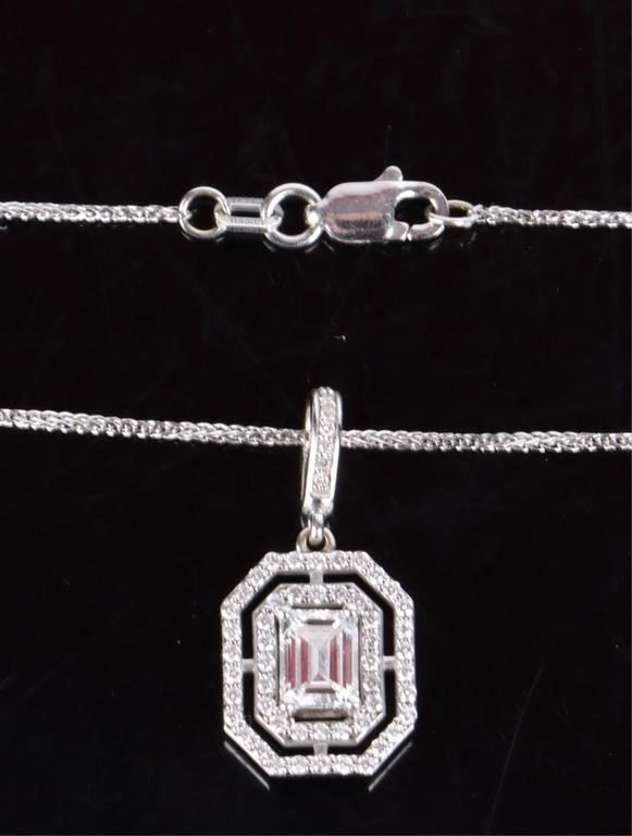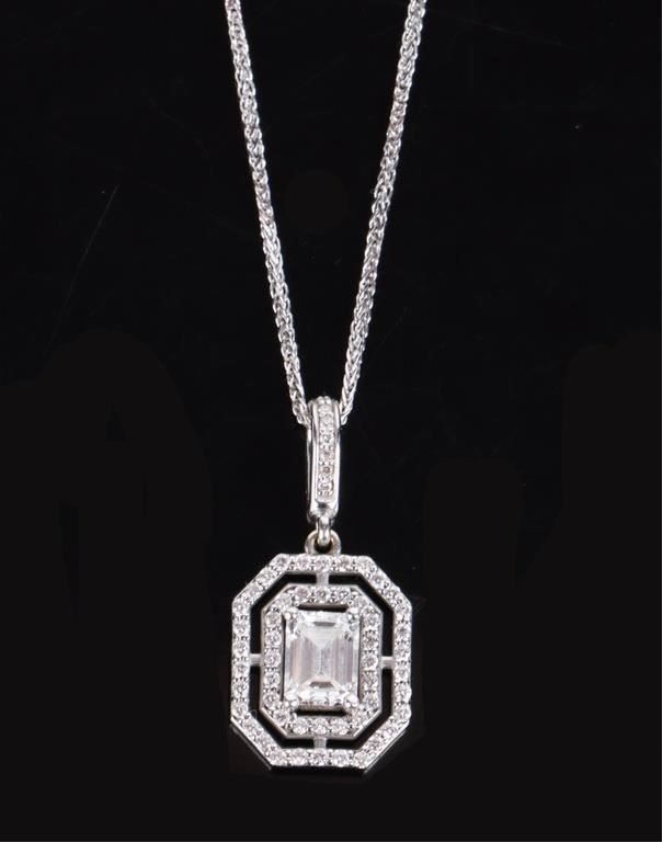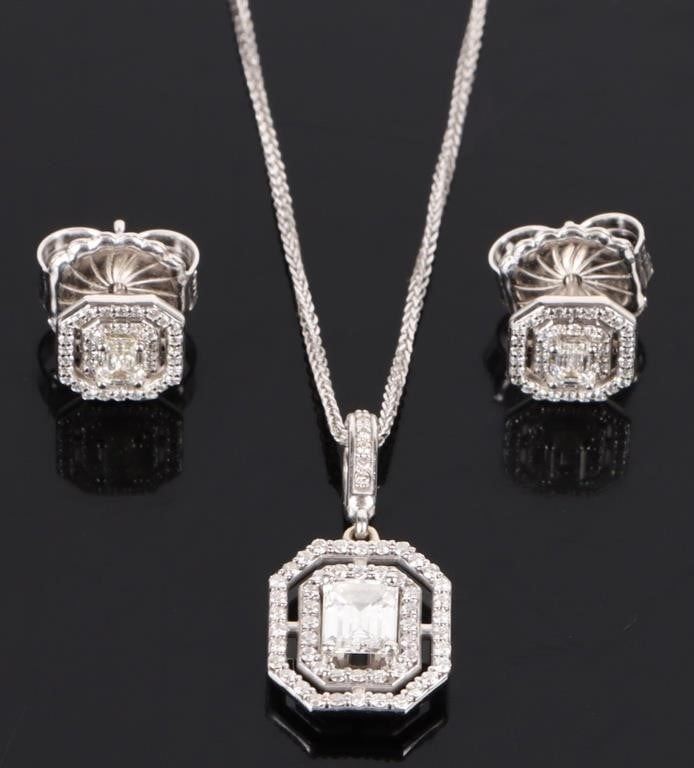 1.39CTW Diamond 14k white gold matching set to include one pair of diamond earrings with two 0.15ct emerald-cut diamonds VVS-2 color I and eighty-four 0.0025ct round diamonds VVS-1 and 2 E-H color. One diamond necklace with one 0.61ct emerald-cut VVS-1 color D diamond, and fifty-eight 0.0025-0.005ct round diamonds VVS1-2 color E-H. Both pieces of jewelry come with a two page appraisal.