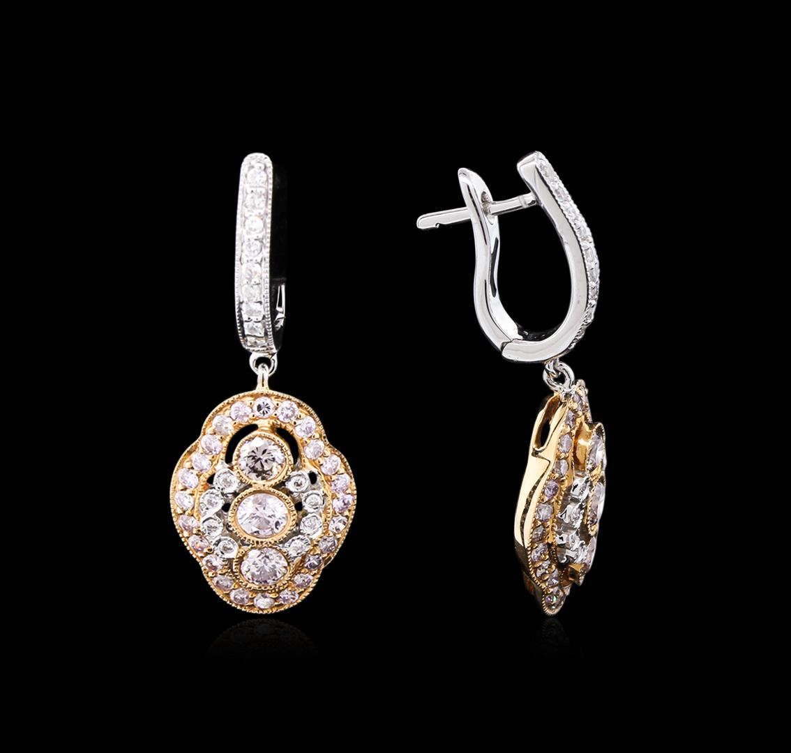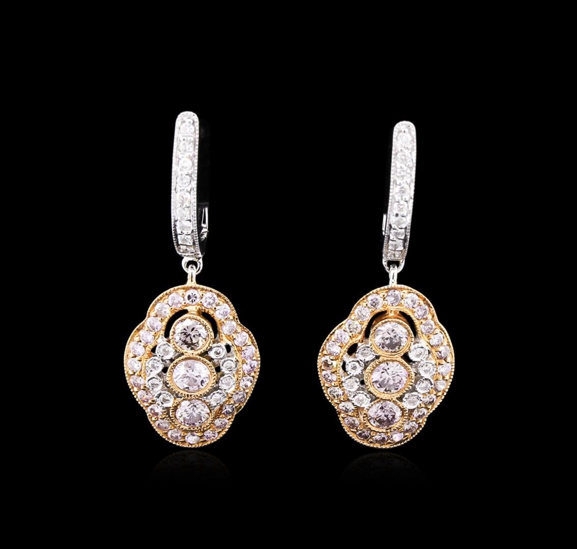 One pair electronically tested 18KT rose and white gold lady's combination cast & assembled designer earrings with hinged clip backs with a bright polish with milgrain detailing finish. Trademark is M. Olivia. Identified with markings of "18K". Condition is new, good workmanship. Containing: Six bezel set round brilliant cut diamonds, measuring 3.20 - 3.10 x 1.89mm (depth est.) approximate total weight of 6 Stones = 0.70ct. Graded in the setting. Clarity: SI-1 to I-1 Cut Very Good Forty-Eight prong set round brilliant cut diamonds, measuring 1.40 - 1.35 x 0.90mm (depth est.) approximate total weight of 48 Stones = 0.50ct. Graded in the setting. Clarity: SI-1 to I-1 Cut Very Good Thirty-Four prong set round brilliant cut diamonds, measuring 1.20 - 1.10 x 0.69mm (depth est.) approximate total weight of 34 Stones = 0.19ct. Graded in the setting. Clarity: VS-2 to SI-1. Color: G - Very Good. Total Weight of Diamonds 1.39ct. Total Weight of Earrings 5.70gm. GAS Appraised at $11,195.00.