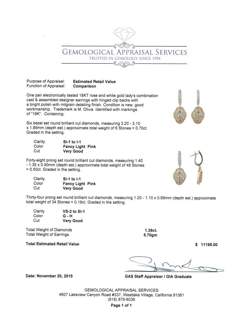 One pair electronically tested 18KT rose and white gold lady's combination cast & assembled designer earrings with hinged clip backs with a bright polish with milgrain detailing finish. Trademark is M. Olivia. Identified with markings of "18K". Condition is new, good workmanship. Containing: Six bezel set round brilliant cut diamonds, measuring 3.20 - 3.10 x 1.89mm (depth est.) approximate total weight of 6 Stones = 0.70ct. Graded in the setting. Clarity: SI-1 to I-1 Cut Very Good Forty-Eight prong set round brilliant cut diamonds, measuring 1.40 - 1.35 x 0.90mm (depth est.) approximate total weight of 48 Stones = 0.50ct. Graded in the setting. Clarity: SI-1 to I-1 Cut Very Good Thirty-Four prong set round brilliant cut diamonds, measuring 1.20 - 1.10 x 0.69mm (depth est.) approximate total weight of 34 Stones = 0.19ct. Graded in the setting. Clarity: VS-2 to SI-1. Color: G - Very Good. Total Weight of Diamonds 1.39ct. Total Weight of Earrings 5.70gm. GAS Appraised at $11,195.00.
