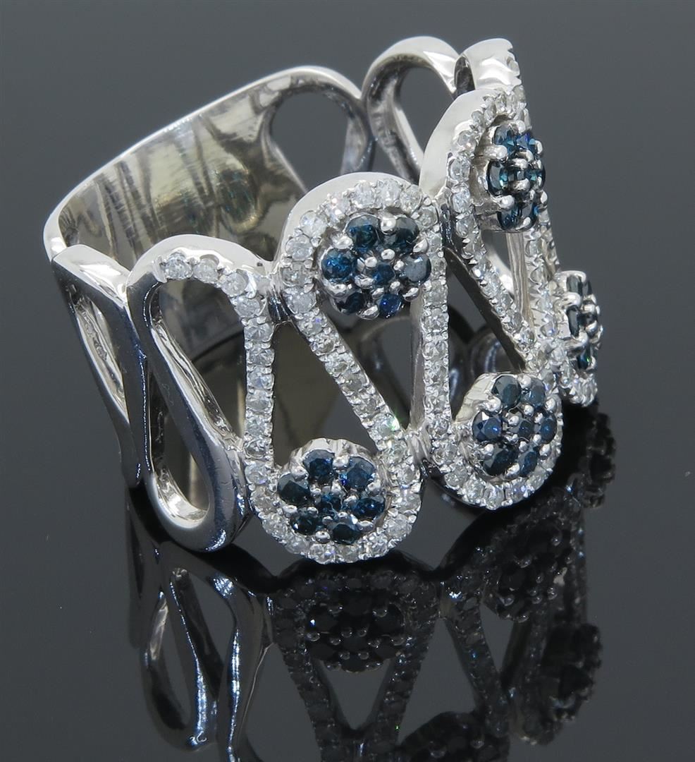 One tested 14K white gold diamond ring. Containing: 97 Round Single Cut Diamonds with H-J color and I-SI clarity. 36 Blue Round Brilliant Cut Diamonds with I-SI clarity. Approximate total diamond weight: 1.39CTW. Diamonds are graded in the mounting, unles