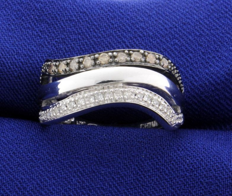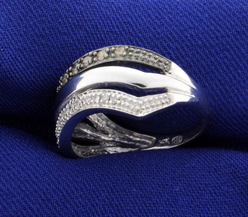 In 14K white gold, it contains .2ct total weight of chocolate diamonds and .14ct total weight of white diamonds. Size 8 1/4 4.1g