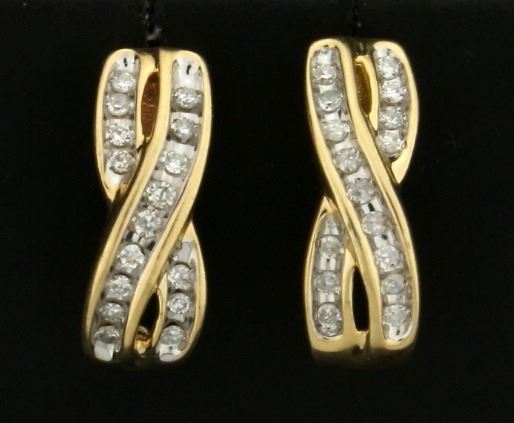 In 14k yellow gold, each earring containing sixteen high quality .01ct diamonds. 5/8 inches long each. 2.6g.