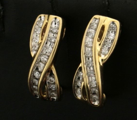 In 14k yellow gold, each earring containing sixteen high quality .01ct diamonds. 5/8 inches long each. 2.6g.