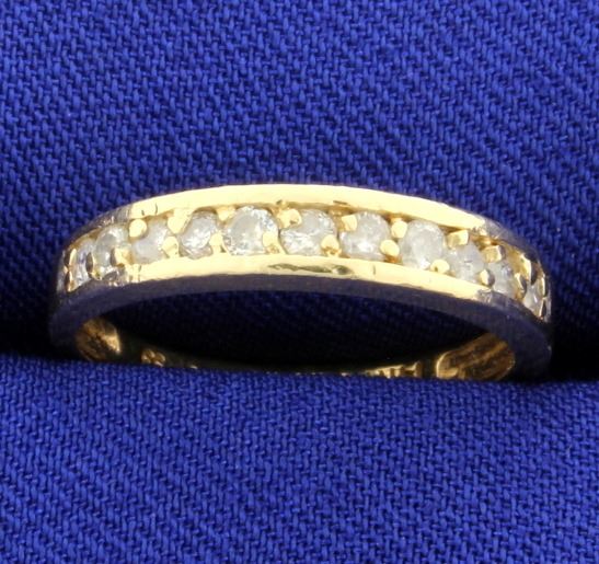 The ring is in 14K yellow gold and contains eleven .03ct diamonds- I color, I clarity. Size 6 2.4g