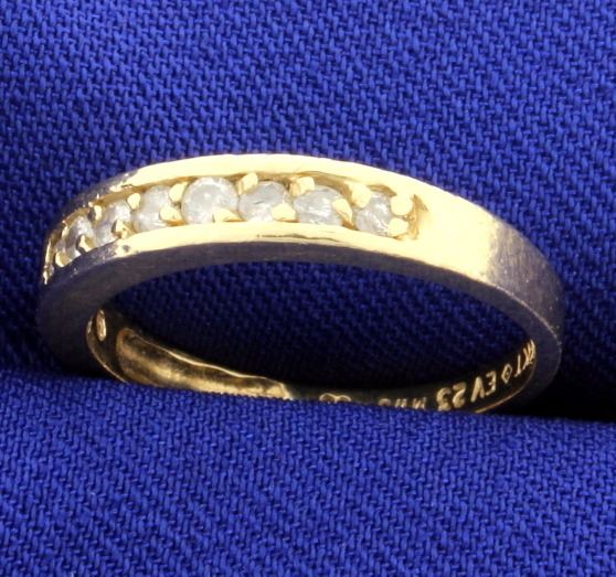 The ring is in 14K yellow gold and contains eleven .03ct diamonds- I color, I clarity. Size 6 2.4g