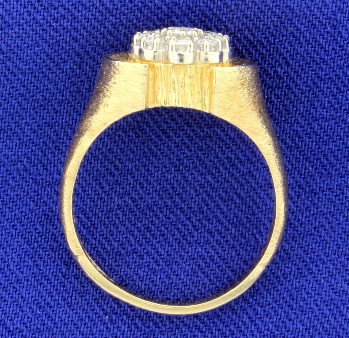 In 14k yellow gold, the center stone is .1ct diamond surrounded by eight .03ct diamonds-all SI clarity/H color. Is brushed gold texture on shank. Size 6 1/4 4.2g