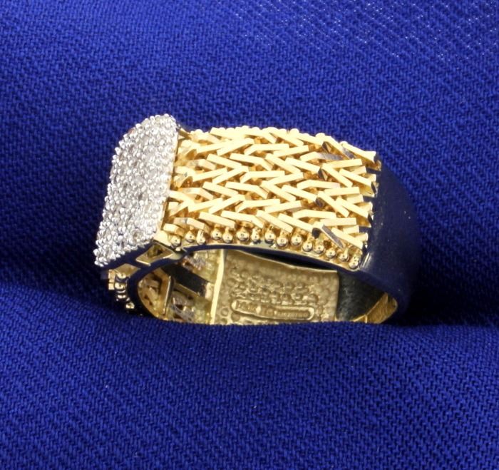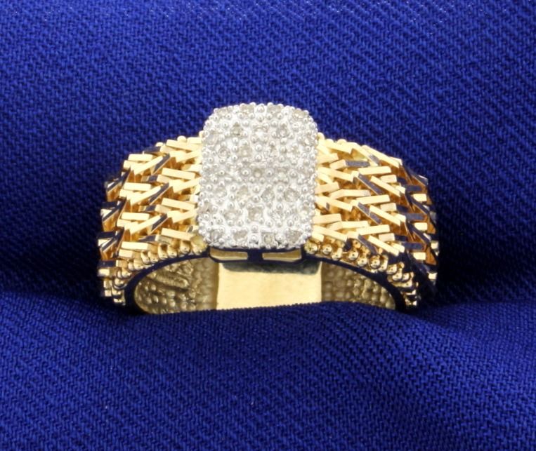 This ring is 14K yellow gold and contains 1/3ct total weight of diamonds. Size 7 1/2 with a very unique design. 6.7g