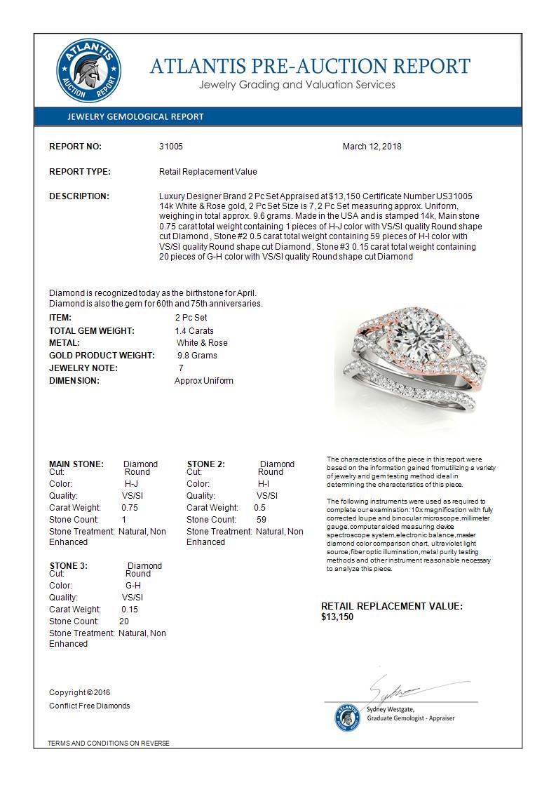 REF-239H5A -31005 ---- 1.4 CTW Certified VS/SI Diamond 2Pc Set Solitaire Halo 14K White & Rose Gold ---- Luxury Designer Brand 2 Pc Set Appraised at $13,150 Certificate Number US31005 14k White & Rose gold, 2 Pc Set Size is 7, 2 Pc Set measuring approx. Uniform, weighing in total approx. 9.6 grams. Made in the USA and is stamped 14k, Main stone 0.75 carat total weight containing 1 pieces of H-J color with VS/SI quality Round shape cut Diamond , Stone #2 0.5 carat total weight containing 59 pieces of H-I color with VS/SI quality Round shape cut Diamond , Stone #3 0.15 carat total weight containing 20 pieces of G-H color with VS/SI quality Round shape cut Diamond