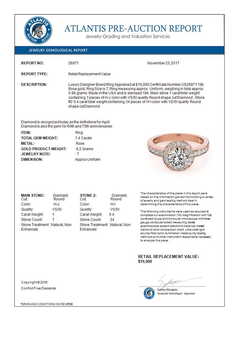 REF-383A8X -26971 ---- 1.4 CTW Certified VS/SI Diamond Solitaire Halo Ring 18K Rose Gold ---- Luxury Designer Brand Ring Appraised at $19,000 Certificate Number US26971 18k Rose gold, Ring Size is 7, Ring measuring approx. Uniform, weighing in total approx. 5.98 grams. Made in the USA and is stamped 18k, Main stone 1 carat total weight containing 1 pieces of H-J color with VS/SI quality Round shape cut Diamond , Stone #2 0.4 carat total weight containing 34 pieces of H-I color with VS/SI quality Round shape cut Diamond