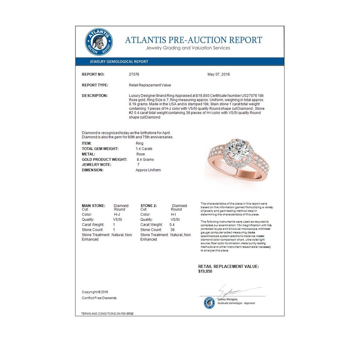 REF-401H5A -27076 ---- 1.4 CTW Certified VS/SI Diamond Solitaire Halo Ring 18K Rose Gold ---- Luxury Designer Brand Ring Appraised at $19,850 Certificate Number US27076 18k Rose gold, Ring Size is 7, Ring measuring approx. Uniform, weighing in total approx. 8.19 grams. Made in the USA and is stamped 18k, Main stone 1 carat total weight containing 1 pieces of H-J color with VS/SI quality Round shape cut Diamond , Stone #2 0.4 carat total weight containing 36 pieces of H-I color with VS/SI quality Round shape cut Diamond