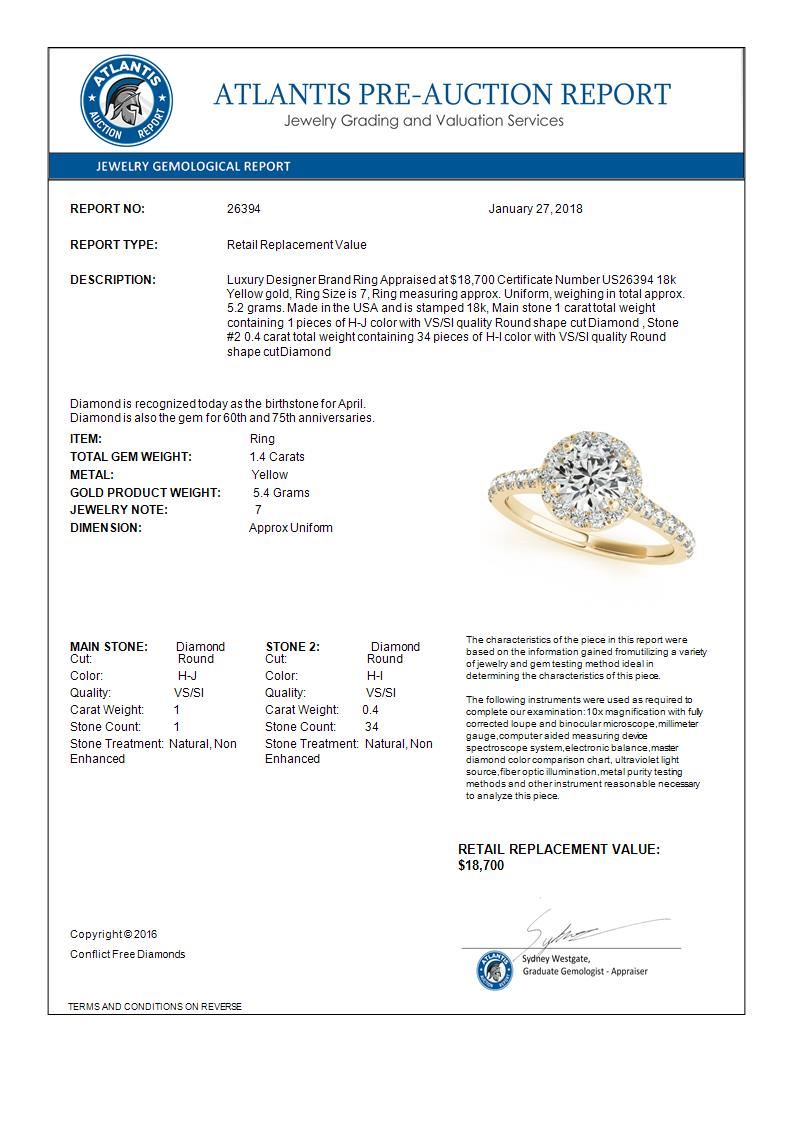 REF-377N6Y -26394 ---- 1.4 CTW Certified VS/SI Diamond Solitaire Halo Ring 18K Yellow Gold ---- Luxury Designer Brand Ring Appraised at $18,700 Certificate Number US26394 18k Yellow gold, Ring Size is 7, Ring measuring approx. Uniform, weighing in total approx. 5.2 grams. Made in the USA and is stamped 18k, Main stone 1 carat total weight containing 1 pieces of H-J color with VS/SI quality Round shape cut Diamond , Stone #2 0.4 carat total weight containing 34 pieces of H-I color with VS/SI quality Round shape cut Diamond