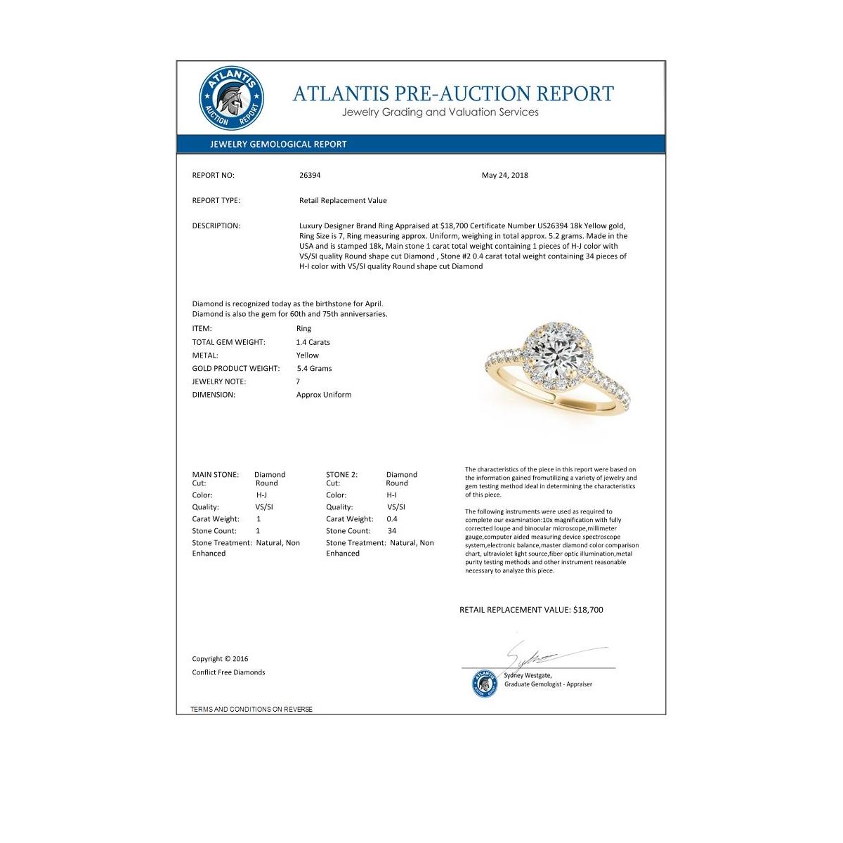 REF-377N6Y -26394 ---- 1.4 CTW Certified VS/SI Diamond Solitaire Halo Ring 18K Yellow Gold ---- Luxury Designer Brand Ring Appraised at $18,700 Certificate Number US26394 18k Yellow gold, Ring Size is 7, Ring measuring approx. Uniform, weighing in total approx. 5.2 grams. Made in the USA and is stamped 18k, Main stone 1 carat total weight containing 1 pieces of H-J color with VS/SI quality Round shape cut Diamond , Stone #2 0.4 carat total weight containing 34 pieces of H-I color with VS/SI quality Round shape cut Diamond