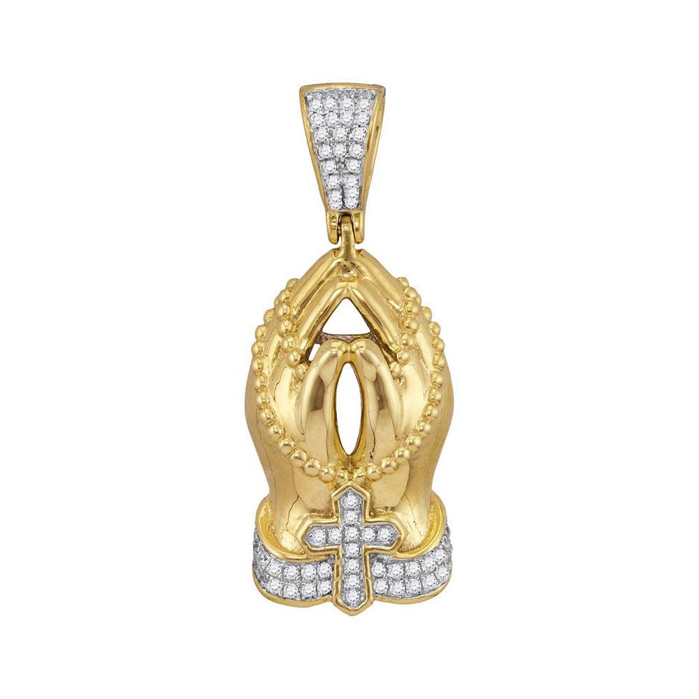 10kt Yellow Gold Mens Round Diamond Rosary Praying Hands Charm Pendant 1/4 Cttw