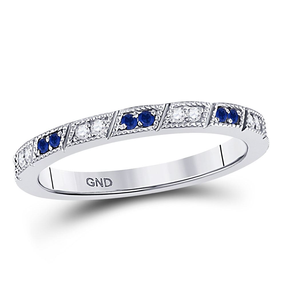 10kt White Gold Womens Round Blue Sapphire Diamond Milgrain Stackable Band Ring 1/4 Cttw