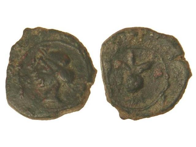 1/4 Calco. - CARTAGONOVA. - Anv.: Cabeza de Tanit a izquierda. Rev.: Casco. 1,80 grs. Pátina negra. (Leves oxidaciones). AB-523; Vill-46. MBC+. - -