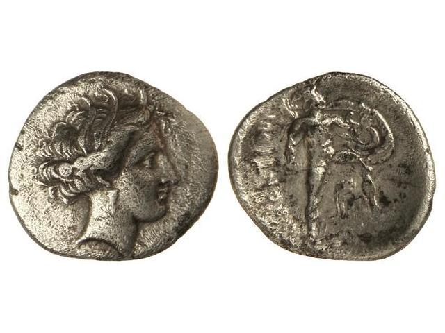 1/4 Estátera. - 369-338 a.C. - LOKIS OPUNTIA. - Anv.: Cabeza de Perséfone a derecha. Rev.: Ajax con casco y escudo avanzando a derecha. 2,50 grs. (Oxidaciones). Se-2330. MBC/MBC-. - -