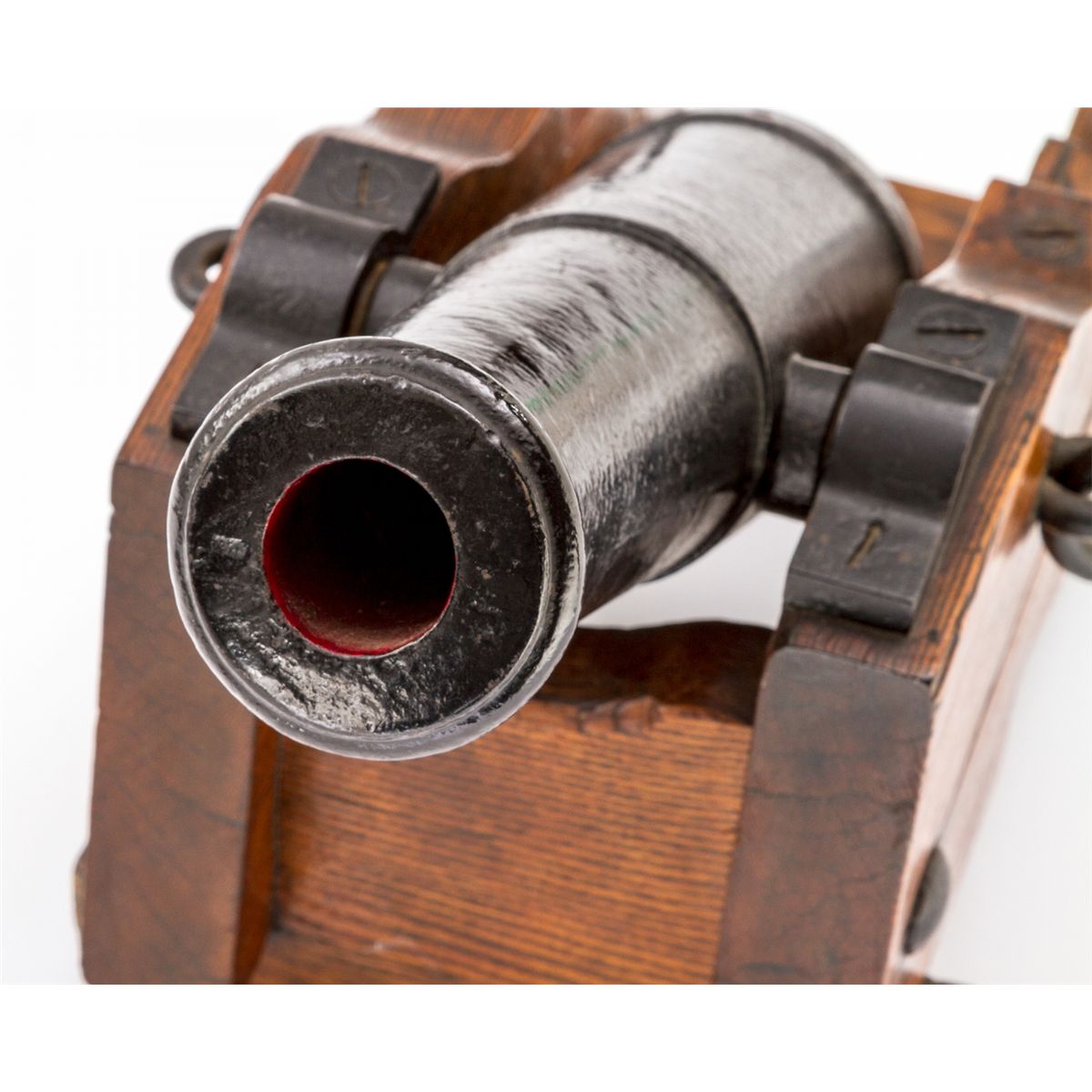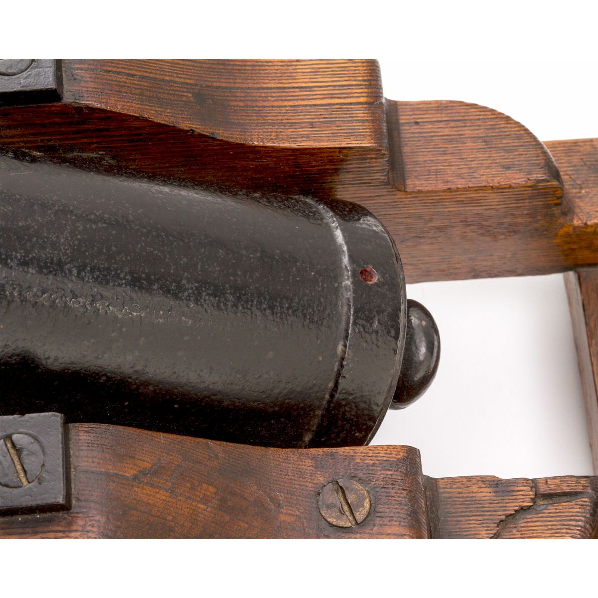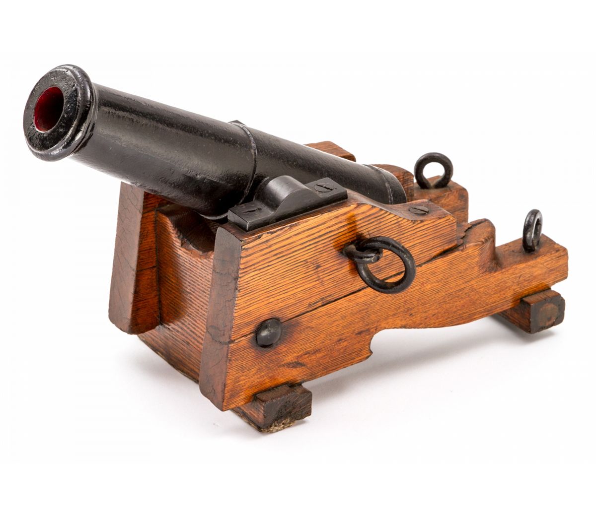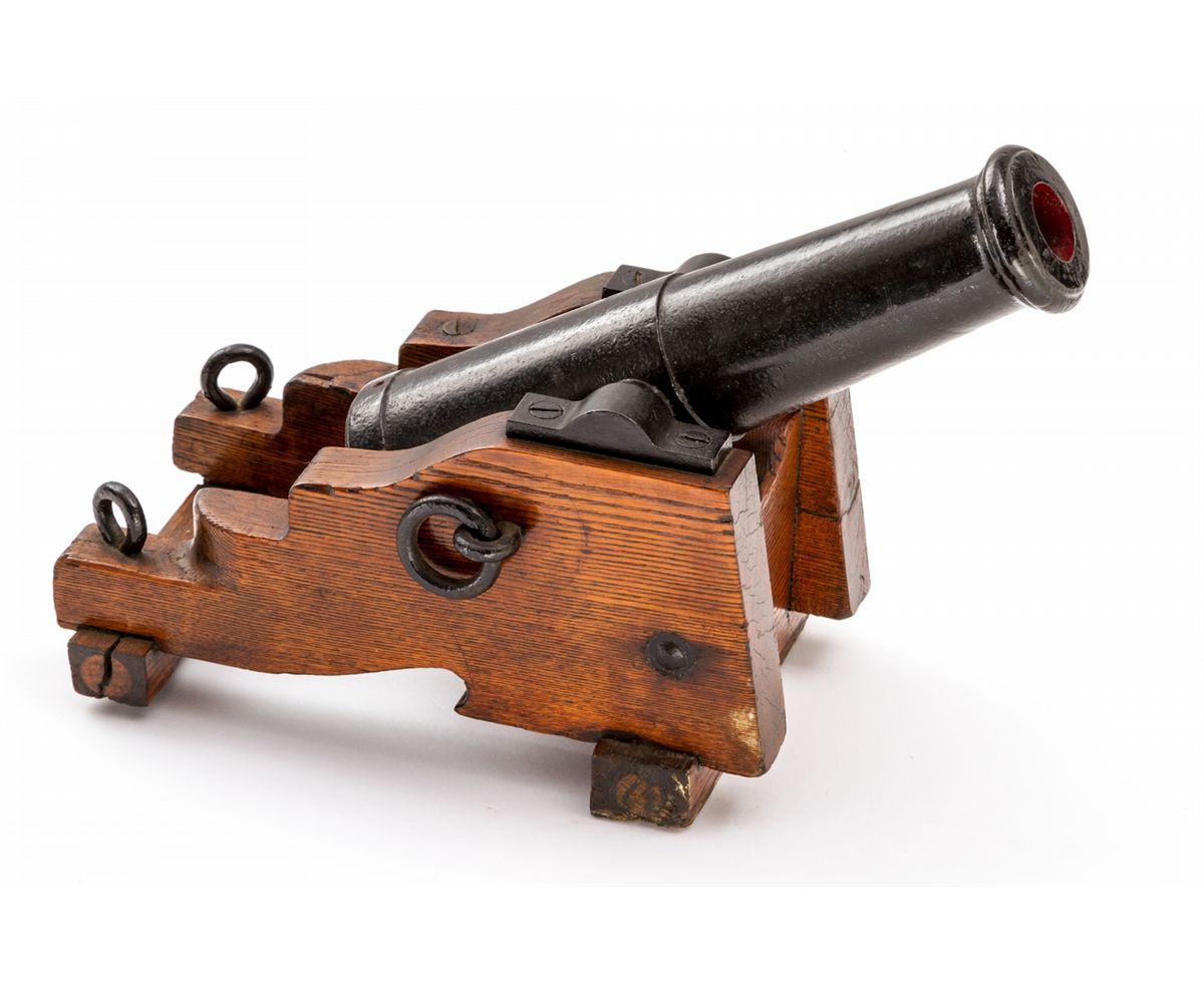 Quarter-Scale Model of Civil War Era Naval Cannon, 1-1/4'' bore, cannon overall length of 15-1/2'', on oak pedestal without wheels. Condition is very good with later coat of paint to iron tube and hardware. Base with some cracks and small losses. Touch hole is not drilled all the way thru. Est.: $400-$600. (Ernest A. Bryant III estate)
