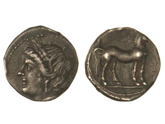 1/4 Shekel. - 220-210 a.C. - ZEUGITANIA. CARTAGO. - Anv.: Cabeza de Tanit a izquierda. Rev.: Caballo parado a derecha. 1,70 grs. AR. Pátina. Se-6499 var. EBC-. - -