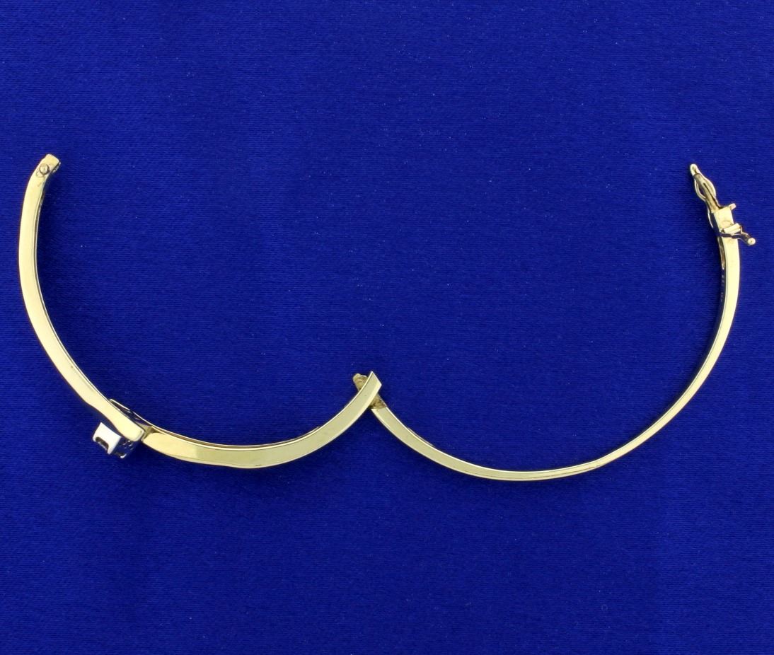 In 10k yellow gold. Contains a 1/4 ct princess cut high quality diamond, SI clarity/H color. With double safety clasp. 2 1/8 inch inside diameter. Opens/closes for easy putting on and taking off. 9.9g.