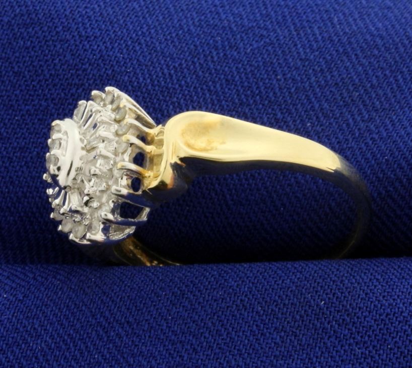 In 10k yellow and white gold. Containing twenty one .01ct high quality round diamonds and four .01ct high quality baguette diamonds, H color/I clarity. Size 10. 3.4g.