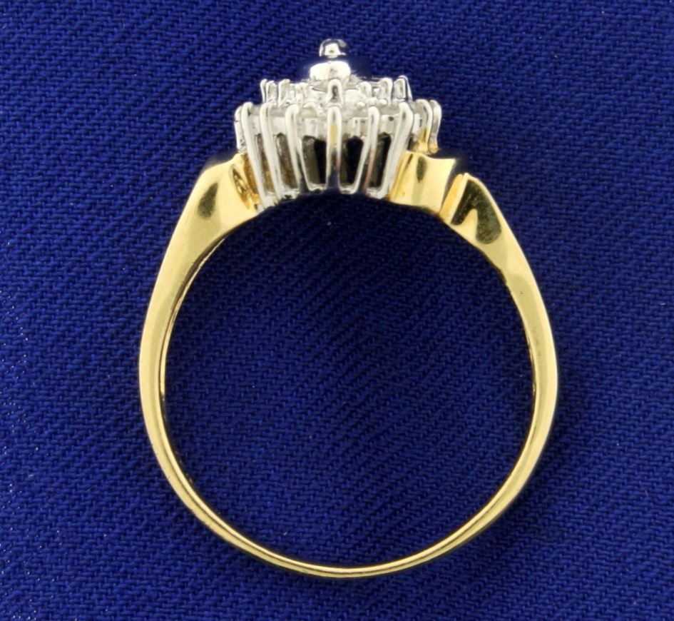 In 10k yellow and white gold. Containing twenty one .01ct high quality round diamonds and four .01ct high quality baguette diamonds, H color/I clarity. Size 10. 3.4g.