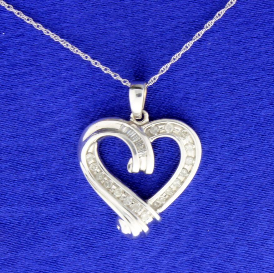In 10k white gold this heart shaped pendant contains 1/4ct total weight diamonds. Comes on a 10k white gold 18 inch chain 3.3g