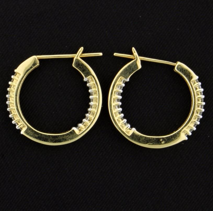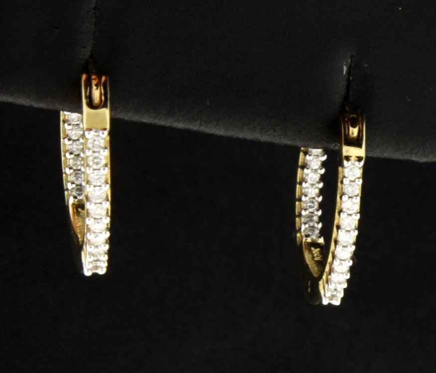 In 10K yellow gold, they are 3/4 inch long. Each earring contains nineteen high quality diamonds - SI clarity/G color. 3.4g