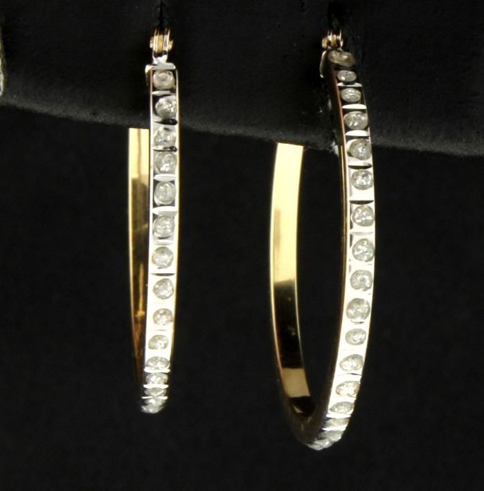 In 14k yellow and white gold each earring contains eighteen round diamonds. 1.2g