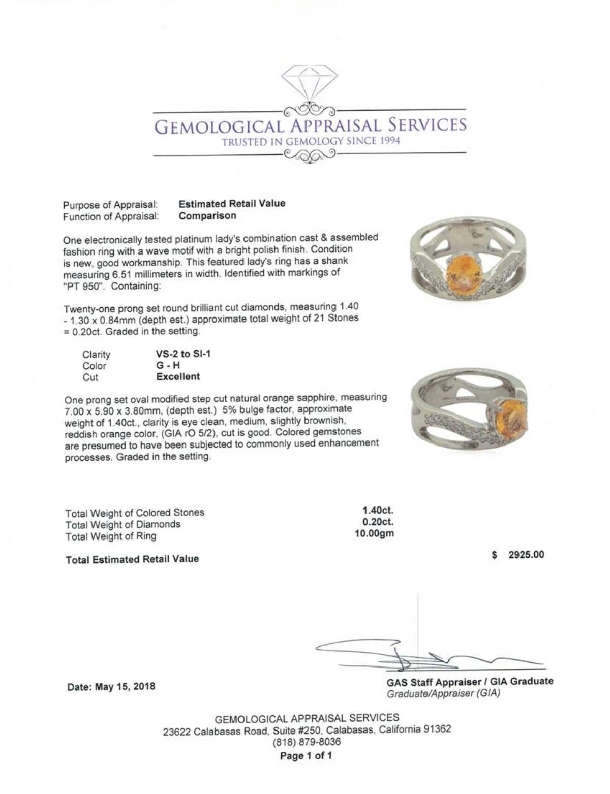 One electronically tested platinum lady's combination cast & assembled fashion ring with a wave motif with a bright polish finish. This featured lady's ring has a shank measuring 6.51 millimeters in width. Identified with markings of 'PT 950'. Condition is new, good workmanship. Containing: Twenty-One prong set round brilliant cut diamonds, measuring 1.40 - 1.30 x 0.84mm (depth est.) approximate total weight of 21 Stones = 0.20ct. Graded in the setting. Color G - H Clarity VS-2 to SI-1 Cut Excellent One prong set oval modified step cut natural orange sapphire, measuring 7.00 x 5.90 x 3.80mm, (depth est.) 5%. bulge factor, approximate weight of 1.40ct., clarity is eye clean, medium, slightly brownish, reddish orange color, (GIA rO 5/2), cut is good. Colored gemstones are presumed to have been subjected to commonly used enhancement processes. Graded in the setting. Total Weight of Colored Stones 1.40ct.. Total Weight of Diamonds 0.20ct.. Total Weight of Ring 10.00gm GAS Appraised at $2925.00. GAS Appraised.