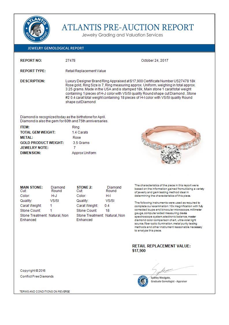27478 - REF-361R5K ---- 1.40 CTW Certified VS/SI Diamond Solitaire Ring 18K Rose Gold ---- Luxury Designer Brand Ring Appraised at $17,900 Certificate Number US27478  18k Rose gold,  Ring Size is 7, Ring measuring approx. Uniform, weighing in total approx. 3.25 grams. Made in the USA and is stamped 18k, Main stone 1 carat total weight containing 1 pieces of H-J color with VS/SI quality Round shape cut Diamond , Stone #2 0.4 carat total weight containing 18 pieces of H-I color with  VS/SI quality Round shape cut Diamond