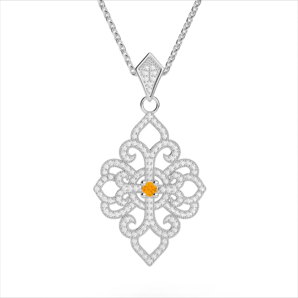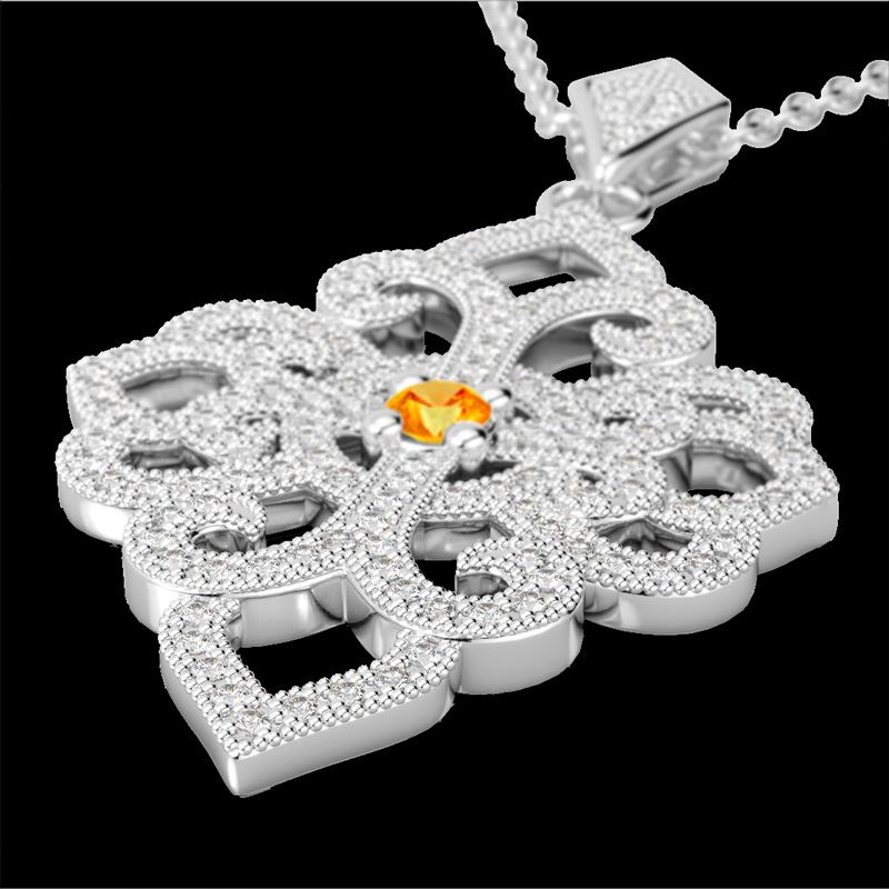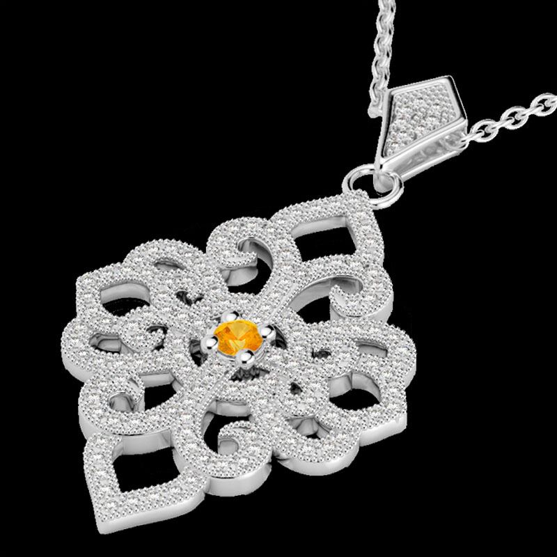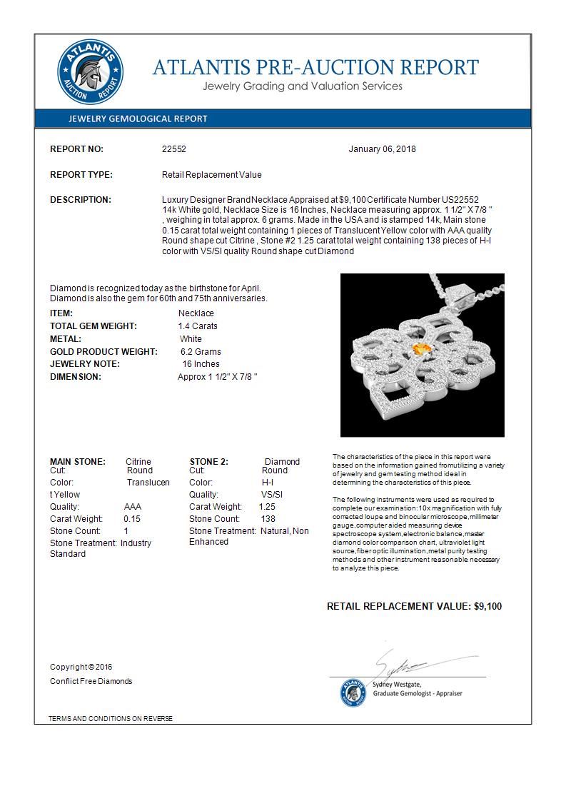 REF-127T3M -22552 ---- 1.40 CTW Citrine & Micro Pave VS/SI Diamond Designer Necklace 14K White Gold ---- Luxury Designer Brand Necklace Appraised at $9,100 Certificate Number US22552 14k White gold, Necklace Size is 16 Inches, Necklace measuring approx. 1 1/2" X 7/8 " , weighing in total approx. 6 grams. Made in the USA and is stamped 14k, Main stone 0.15 carat total weight containing 1 pieces of Translucent Yellow color with AAA quality Round shape cut Citrine , Stone #2 1.25 carat total weight containing 138 pieces of H-I color with VS/SI quality Round shape cut Diamond