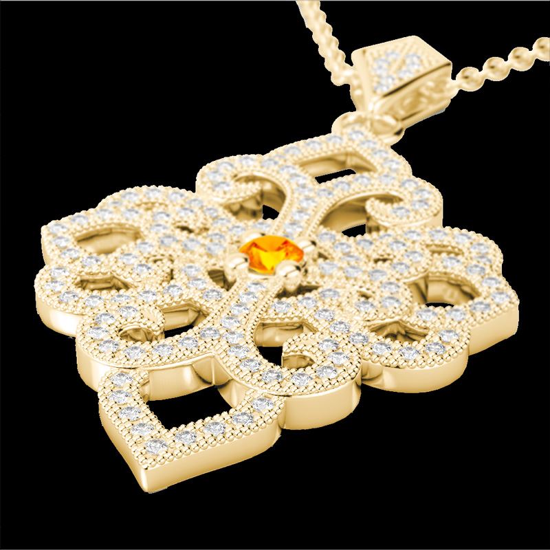 REF-127M3H -22554 ---- 1.40 CTW Citrine & Micro Pave VS/SI Diamond Designer Necklace 14K Yellow Gold ---- Luxury Designer Brand Necklace Appraised at $9,100 Certificate Number US22554 14k Yellow gold, Necklace Size is 16 Inches, Necklace measuring approx. 1 1/2" X 7/8 " , weighing in total approx. 6 grams. Made in the USA and is stamped 14k, Main stone 0.15 carat total weight containing 1 pieces of Translucent Yellow color with AAA quality Round shape cut Citrine , Stone #2 1.25 carat total weight containing 138 pieces of H-I color with VS/SI quality Round shape cut Diamond
