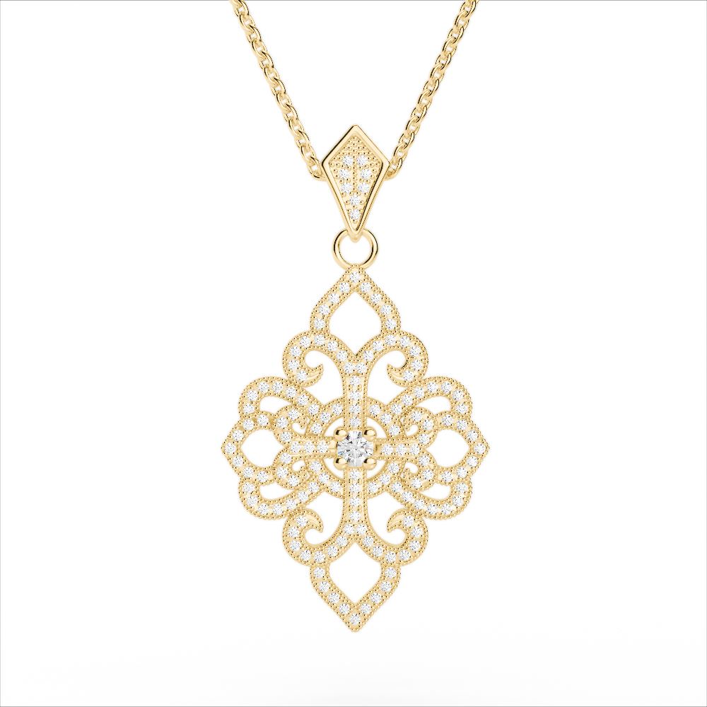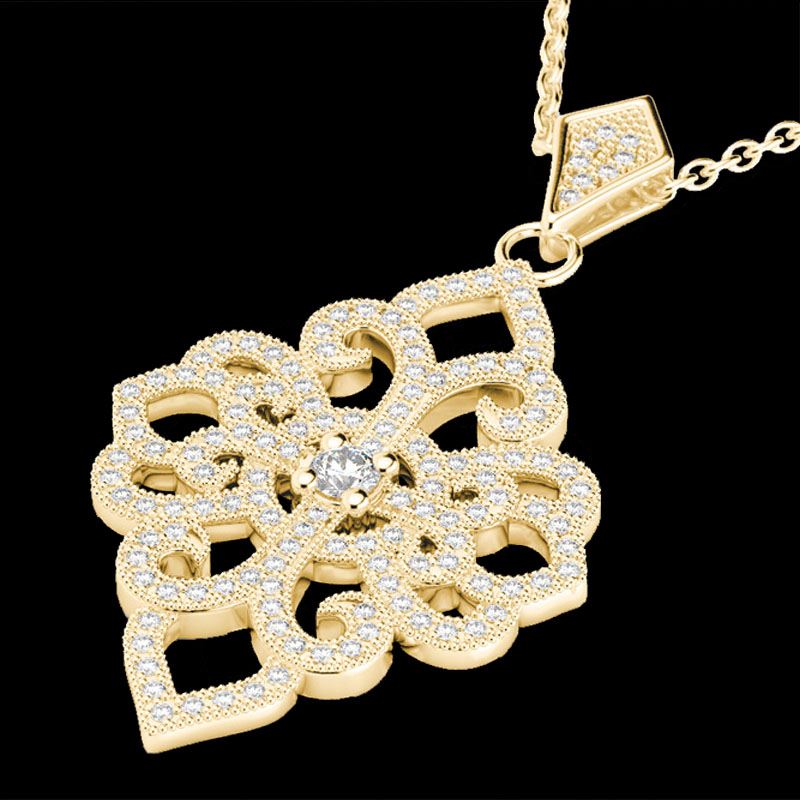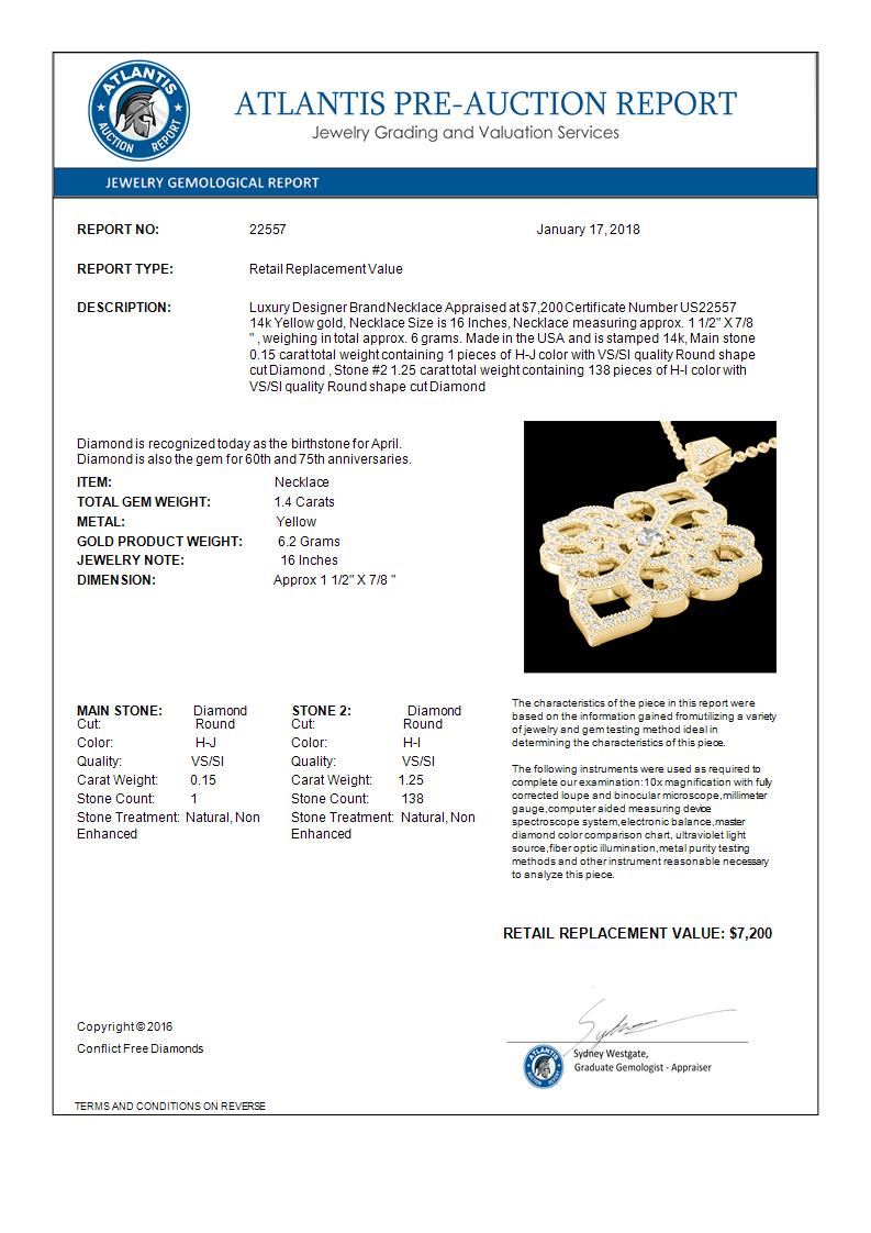 REF-130H9A -22557 ---- 1.40 CTW Micro Pave VS/SI Diamond Designer Necklace 14K Yellow Gold ---- Luxury Designer Brand Necklace Appraised at $7,200 Certificate Number US22557 14k Yellow gold, Necklace Size is 16 Inches, Necklace measuring approx. 1 1/2" X 7/8 " , weighing in total approx. 6 grams. Made in the USA and is stamped 14k, Main stone 0.15 carat total weight containing 1 pieces of H-J color with VS/SI quality Round shape cut Diamond , Stone #2 1.25 carat total weight containing 138 pieces of H-I color with VS/SI quality Round shape cut Diamond